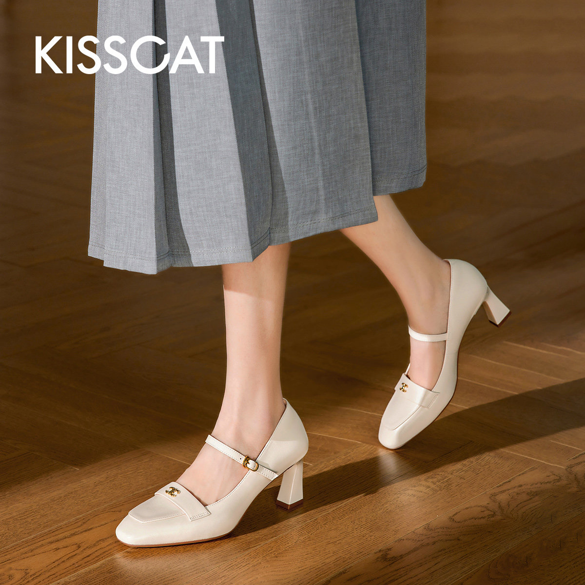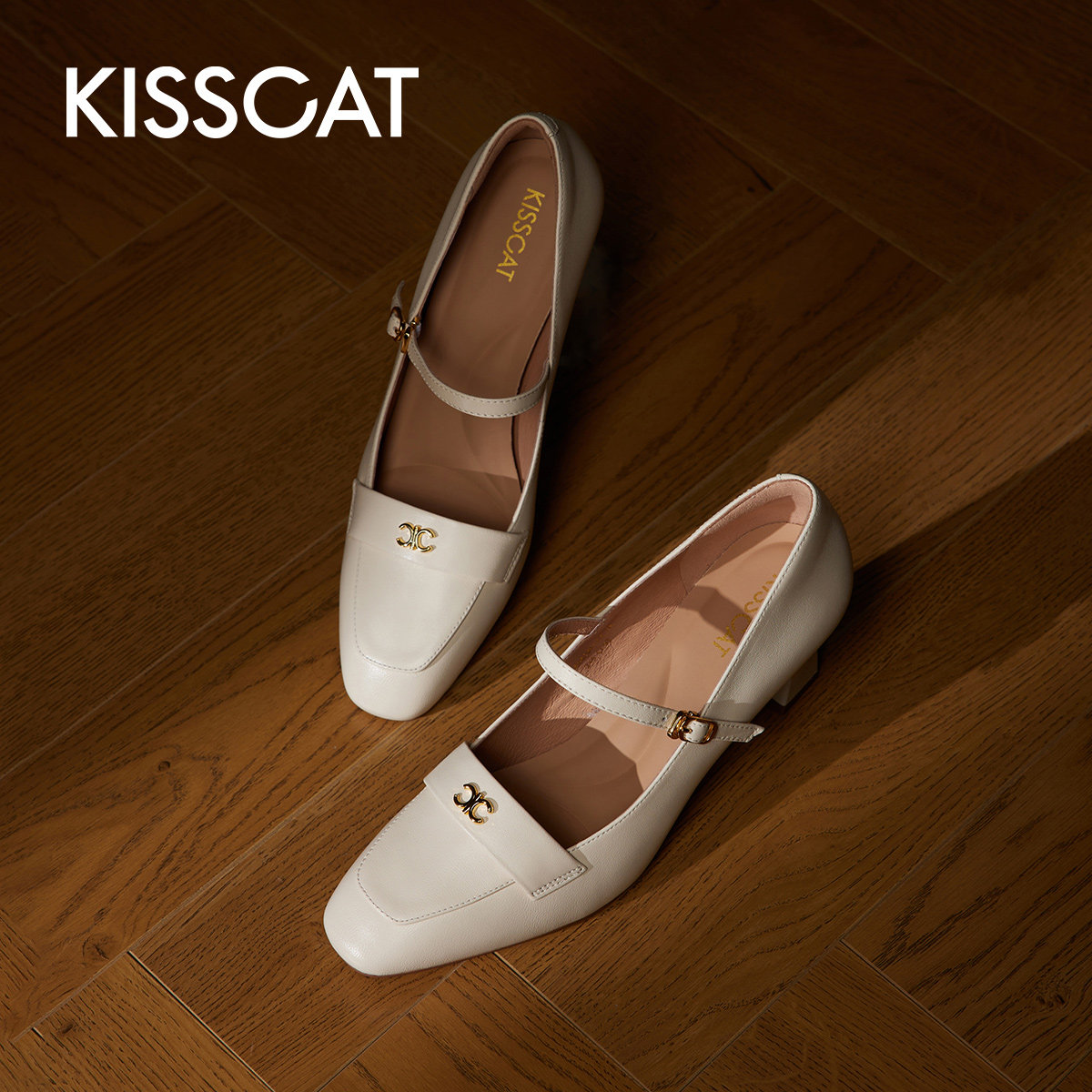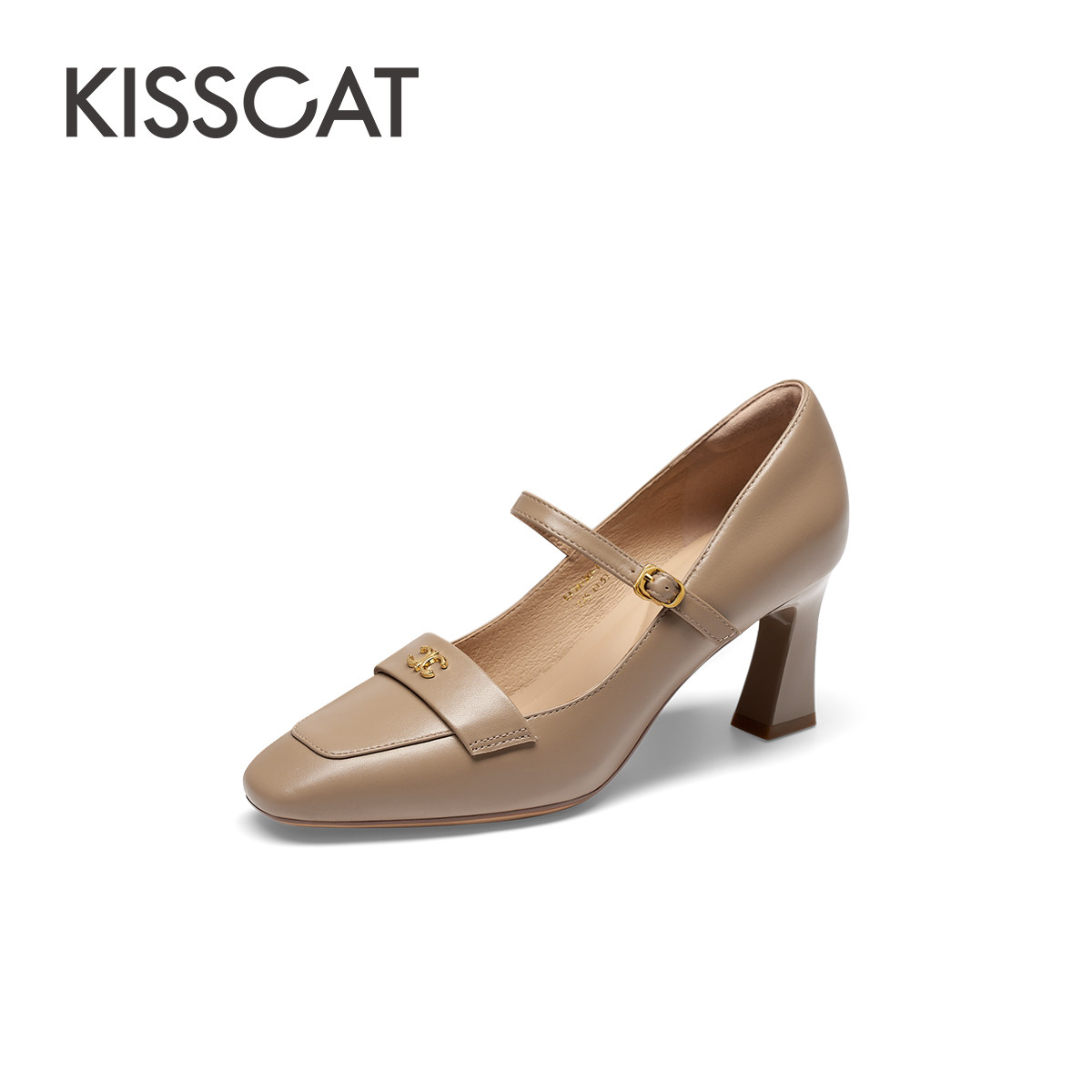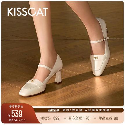 KISSCAT接吻猫[玛丽珍编辑鞋]法式真皮玛丽珍鞋气质粗跟浅口单鞋