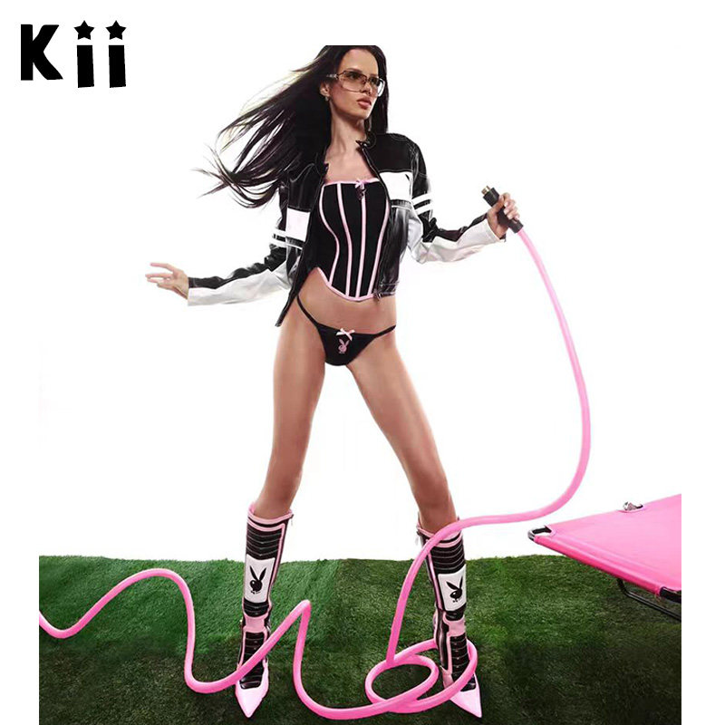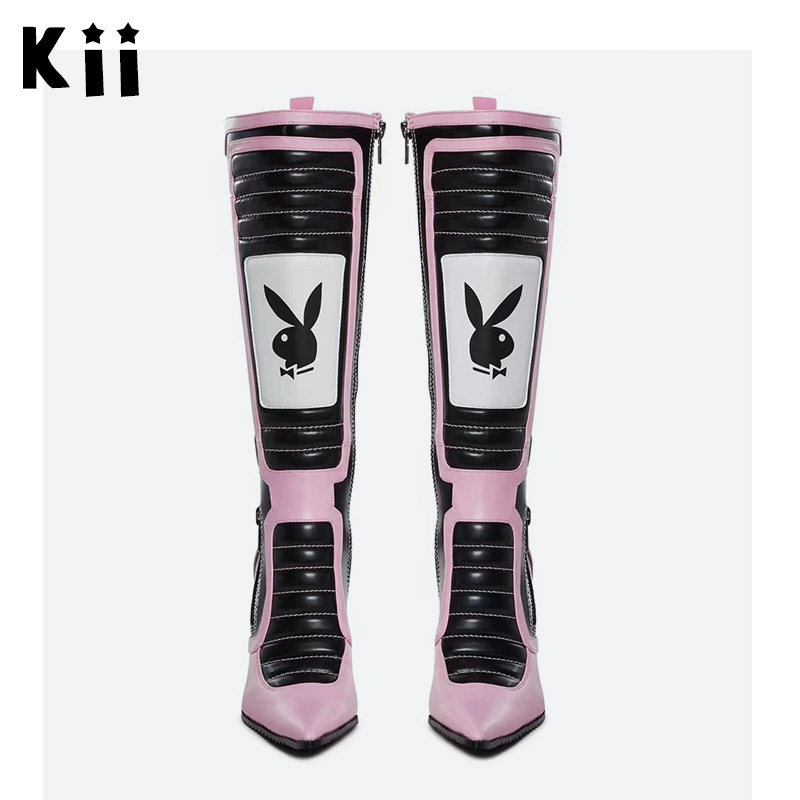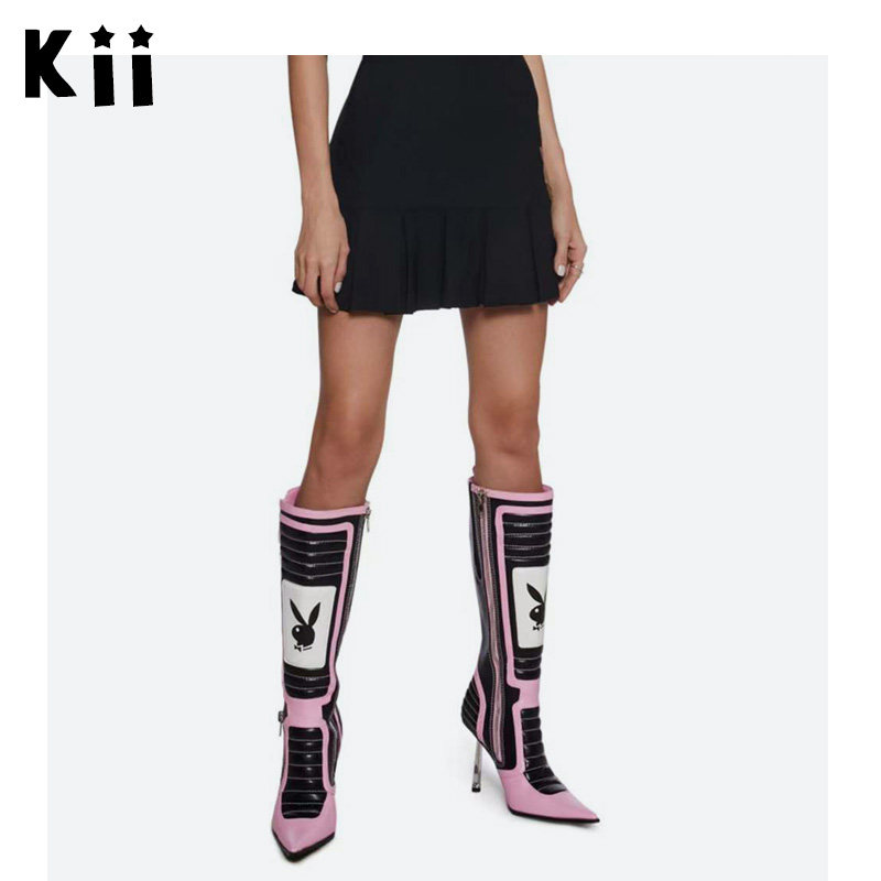 Kii美国正品 Playboy by Dolls Kill 拼色机车风尖头细高跟靴