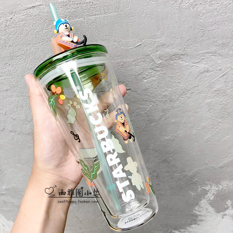 韩国星巴克杯子樱花小熊玻璃吸管杯粉色渐变女神随行杯水杯木盖