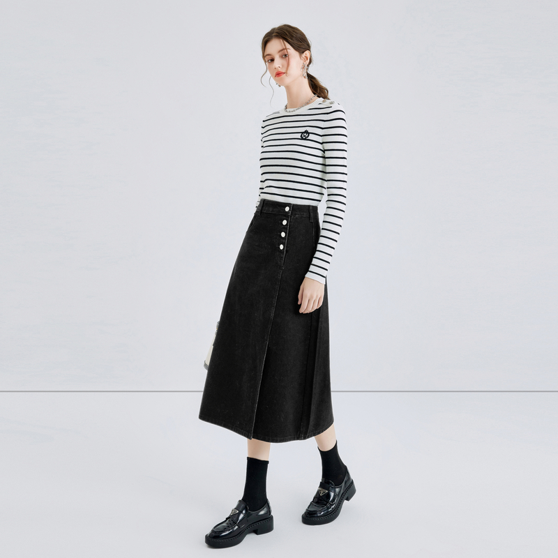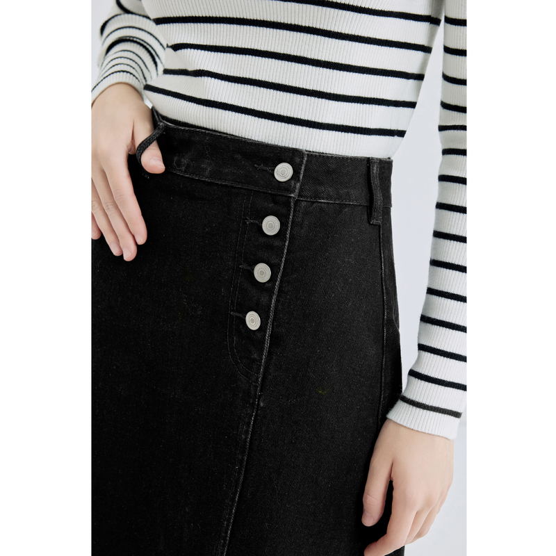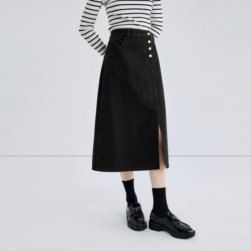 秋水伊人奥莱断码清仓黑色纯棉牛仔半身裙春女高腰开叉中长裙
