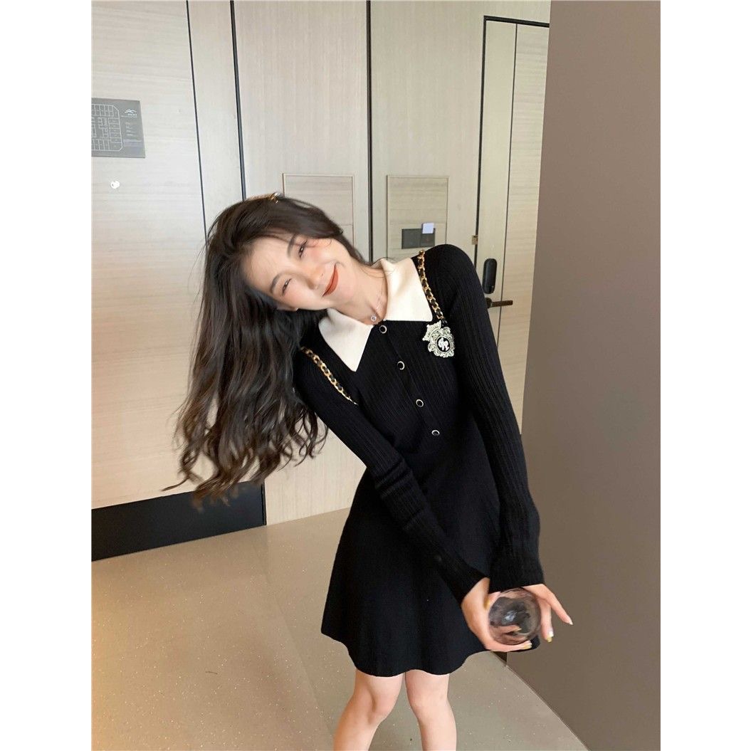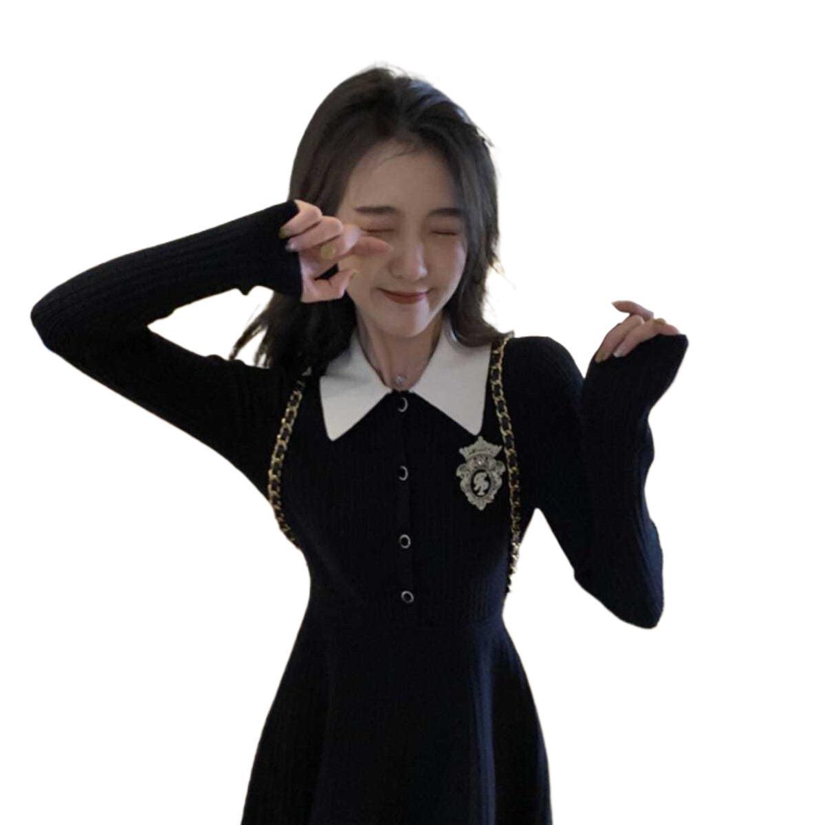 新款黑色长袖针织连衣裙女春秋冬小个子学院风修身显瘦气质小裙子