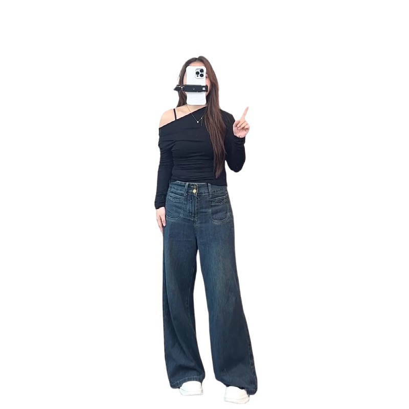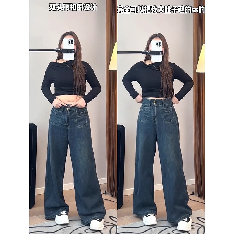 大码美式复古蓝直筒牛仔裤女秋冬加绒胖mm梨形身材显瘦宽松阔腿裤
