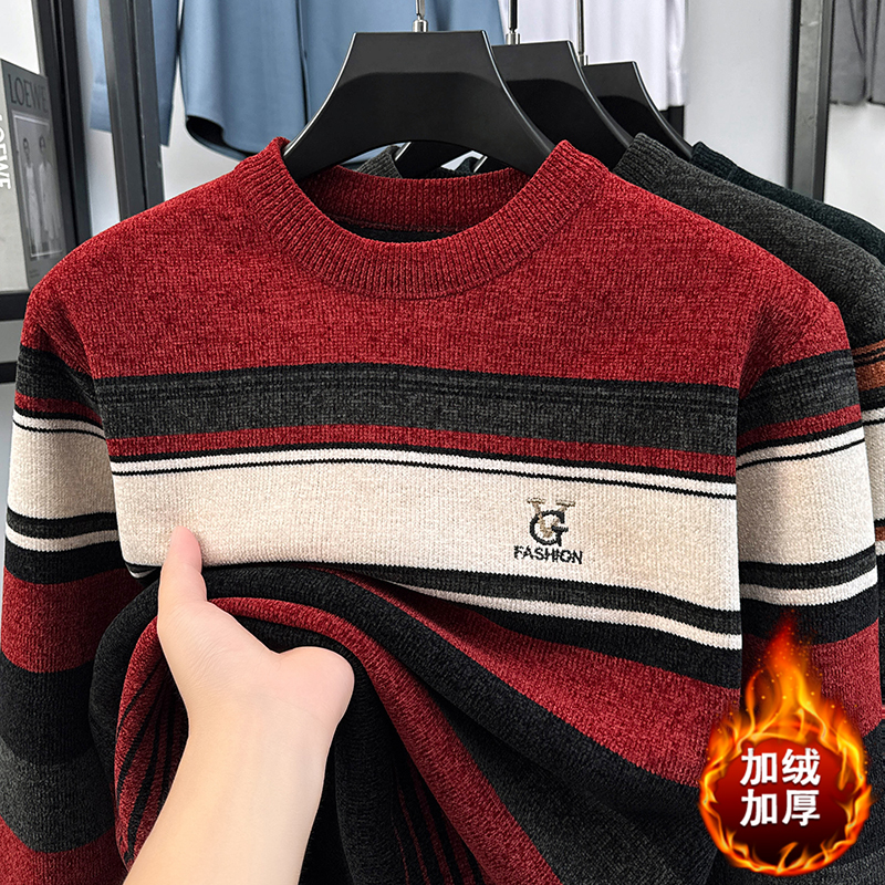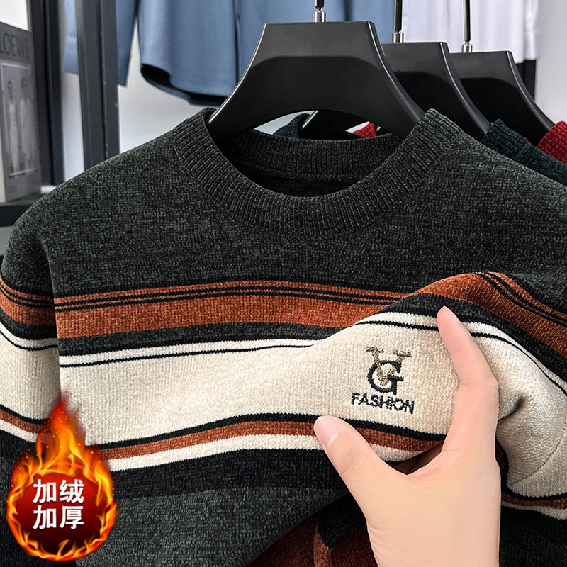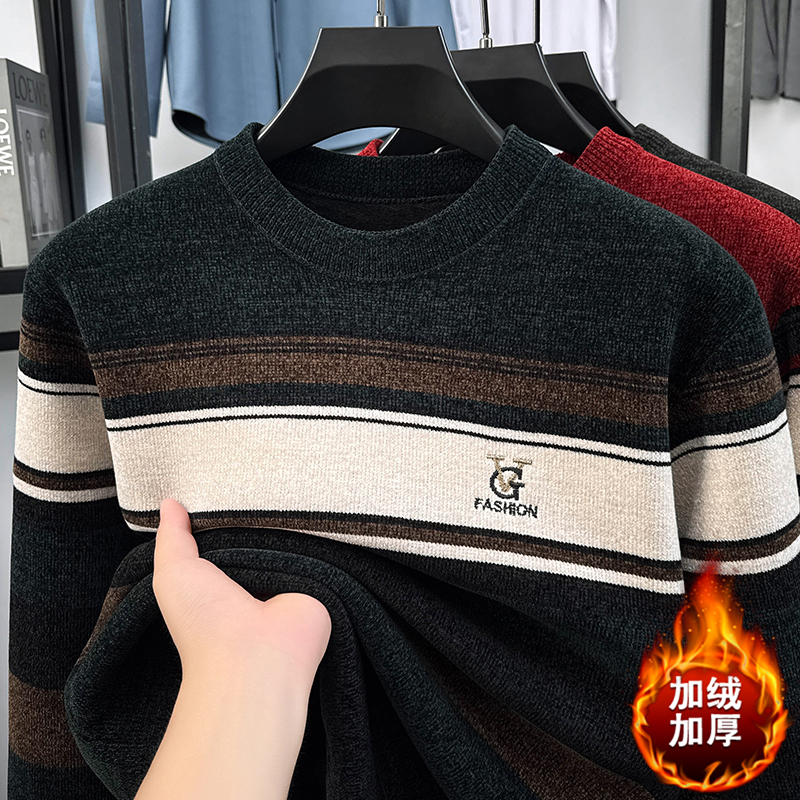 雪尼尔【不起球+加绒加厚】冬季毛衣男圆领针织衫刺绣保暖打底衫