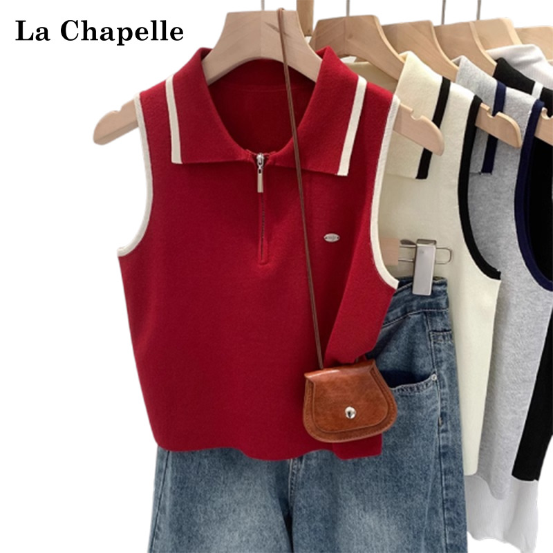 拉夏贝尔半拉链翻领红色针织吊带背心女夏季新款设计感小众上衣