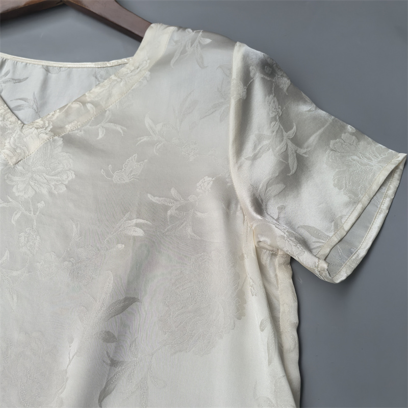 乳白色不透 100%真丝提花透孔花萝上衣桑蚕丝女T恤夏季简约短袖新