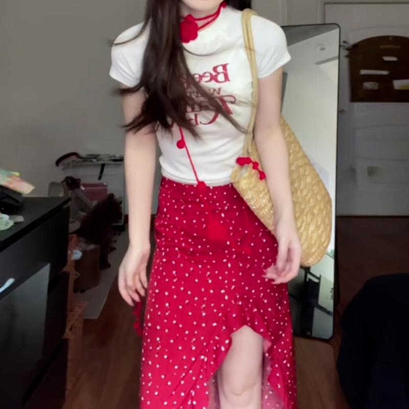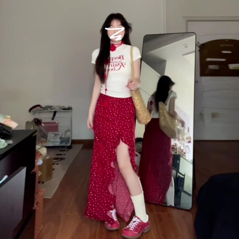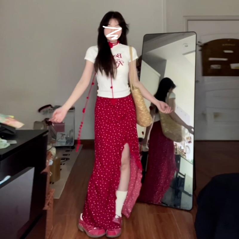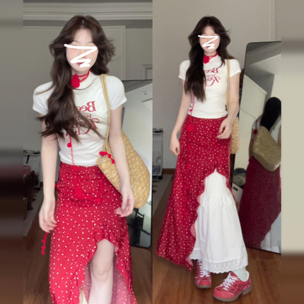 气质红色碎花半身连衣裙女夏季2025新款小个子多巴胺穿搭套装长裙