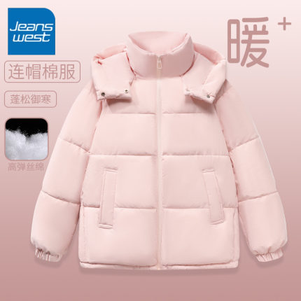 KV真维斯棉袄棉服女2025新款秋冬季浅粉色加厚保暖连帽面包服外套