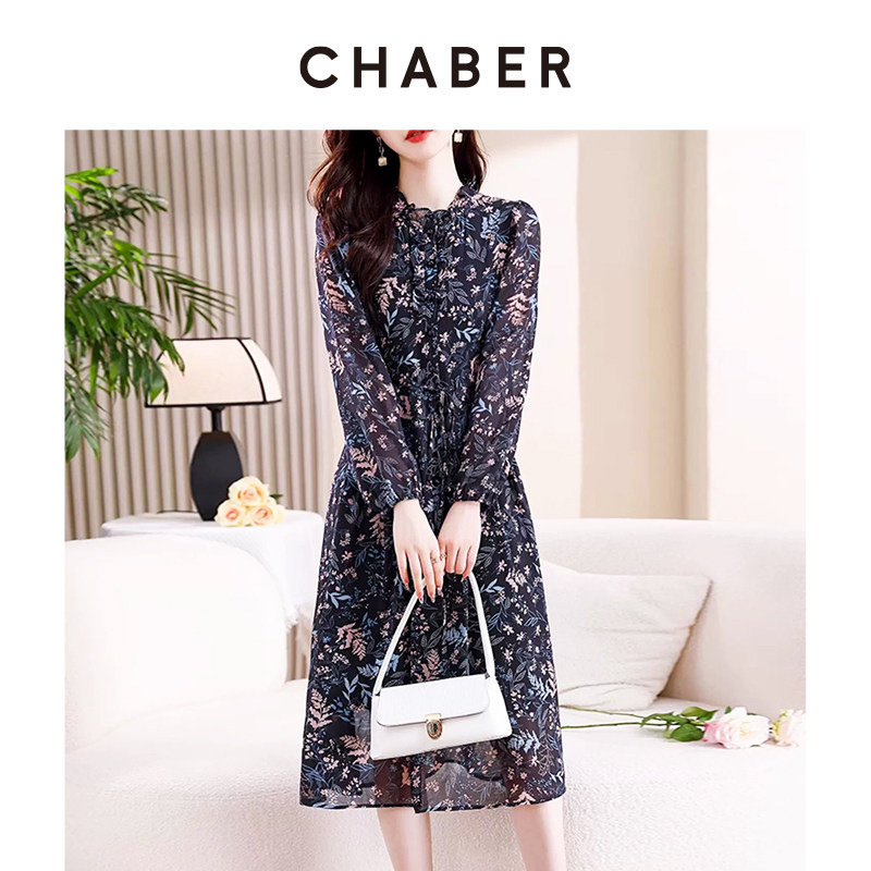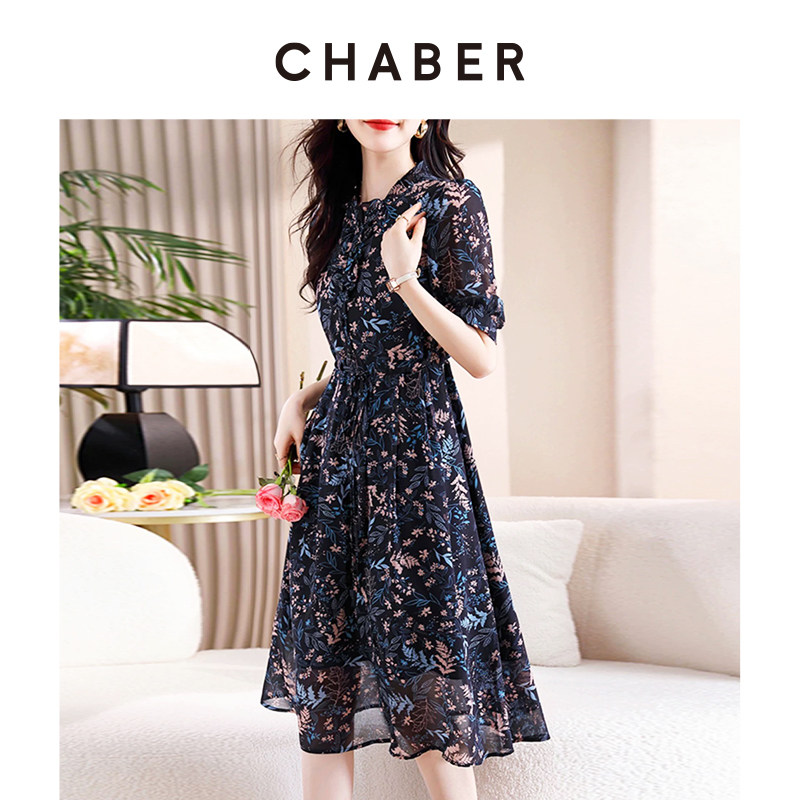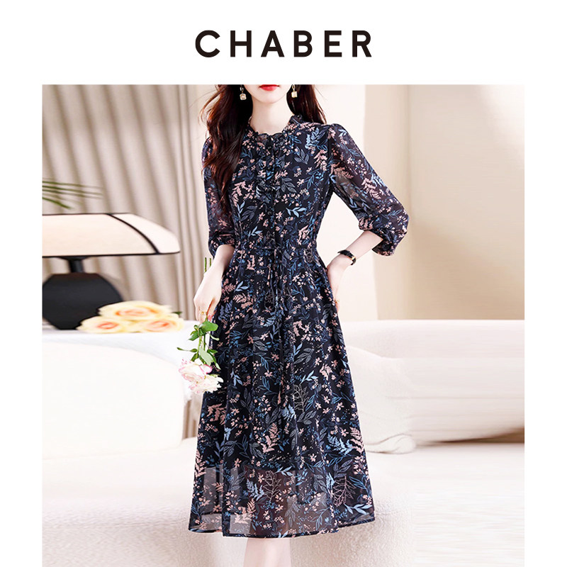 chaber巧帛春季新款优雅气质印花雪纺裙木耳领系带收腰显瘦连衣裙