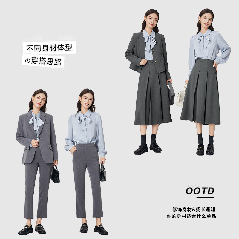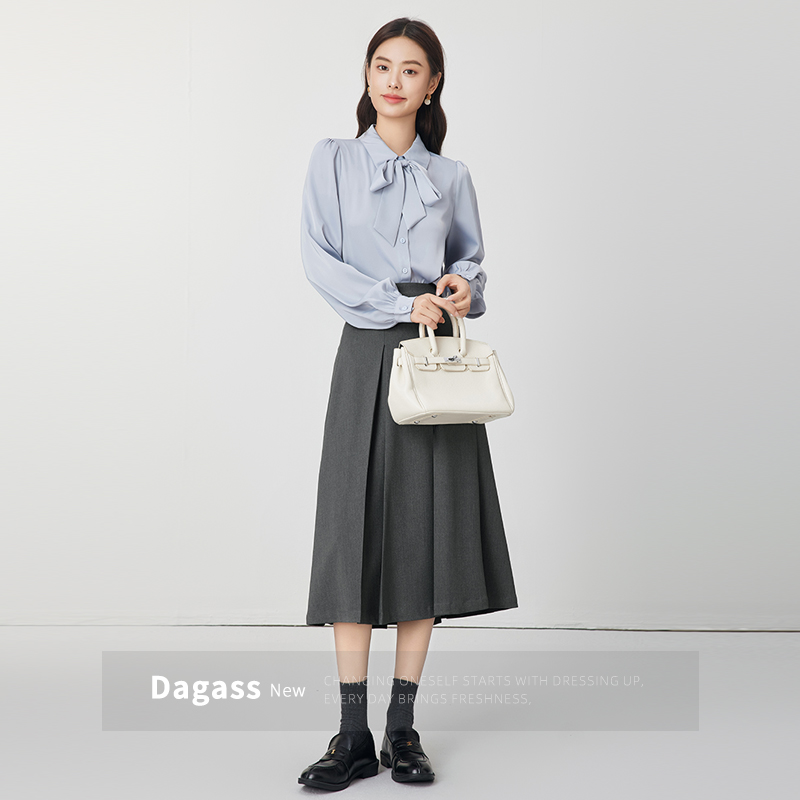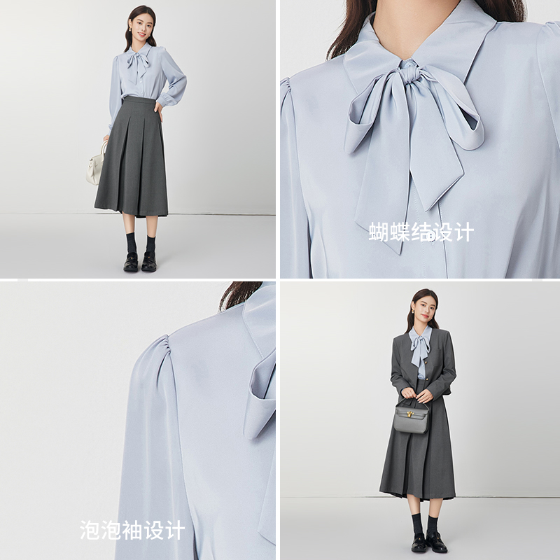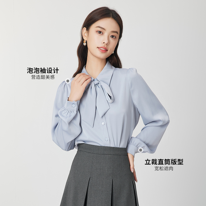达佳诗蓝色衬衫女蝴蝶结飘带领雪纺上衣面试职场通勤穿搭长袖衬衣