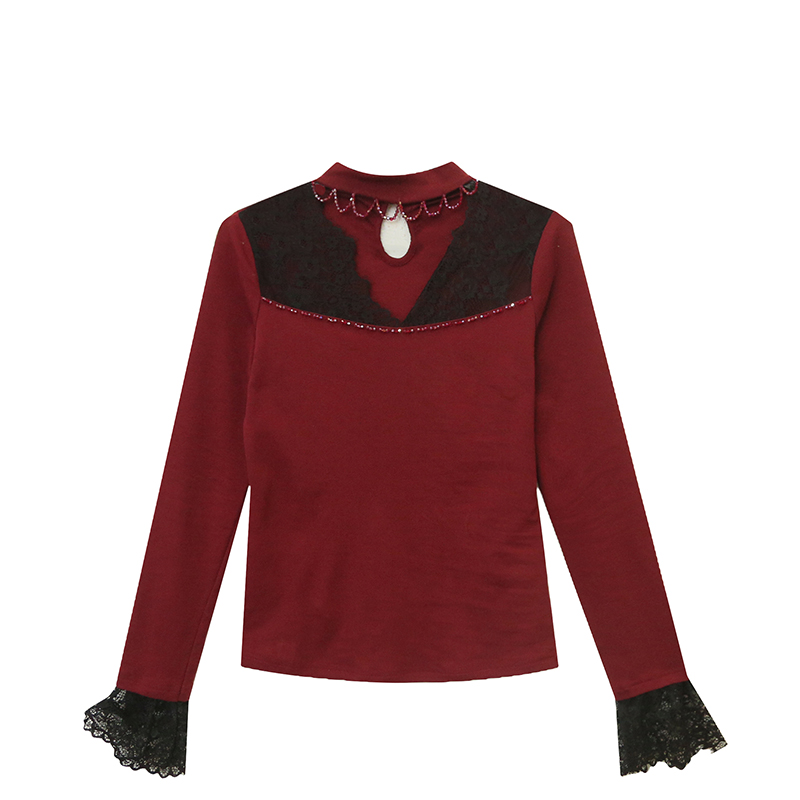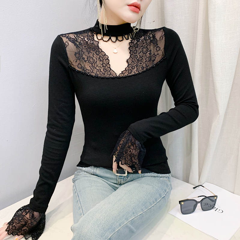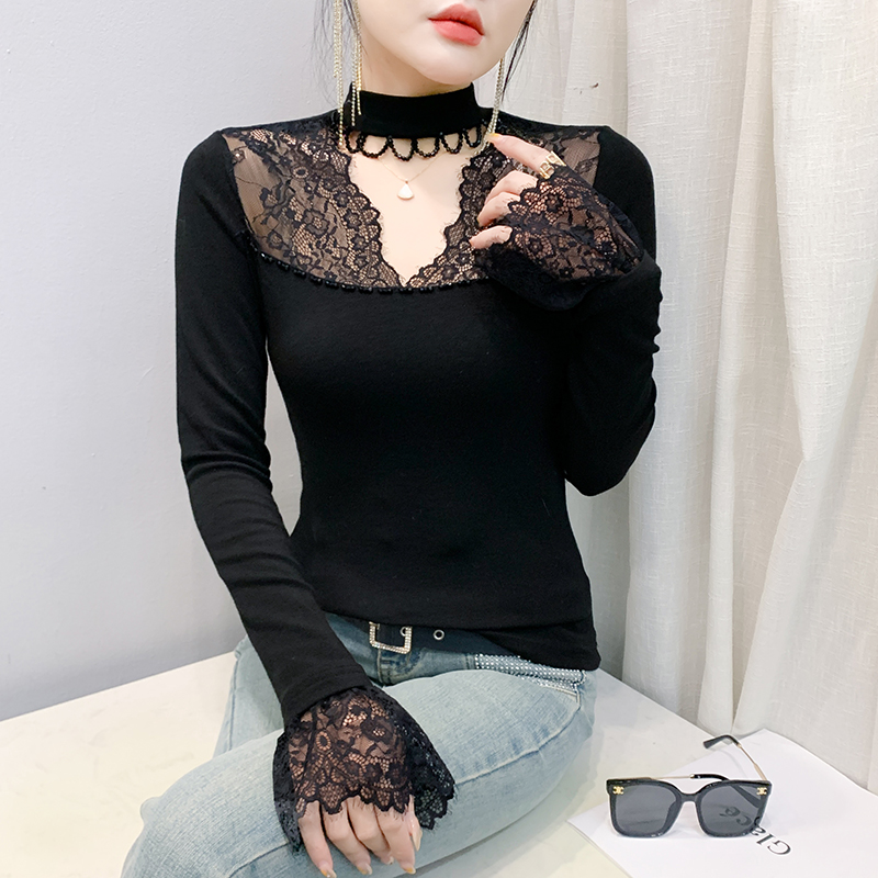 蕾丝拼接镂空长袖t恤女2025秋季新款性感打底衫半高领挂脖上衣