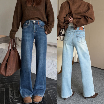 加绒加厚高腰拖地直筒裤女冬季宽松百搭显瘦小个子窄版阔腿牛仔裤
