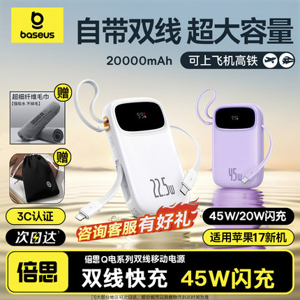 【新国标3c认证】倍思45W充电宝大容量20000毫安超薄便携自带TypeC线快充22.5W移动电源适用苹果17可上飞机16