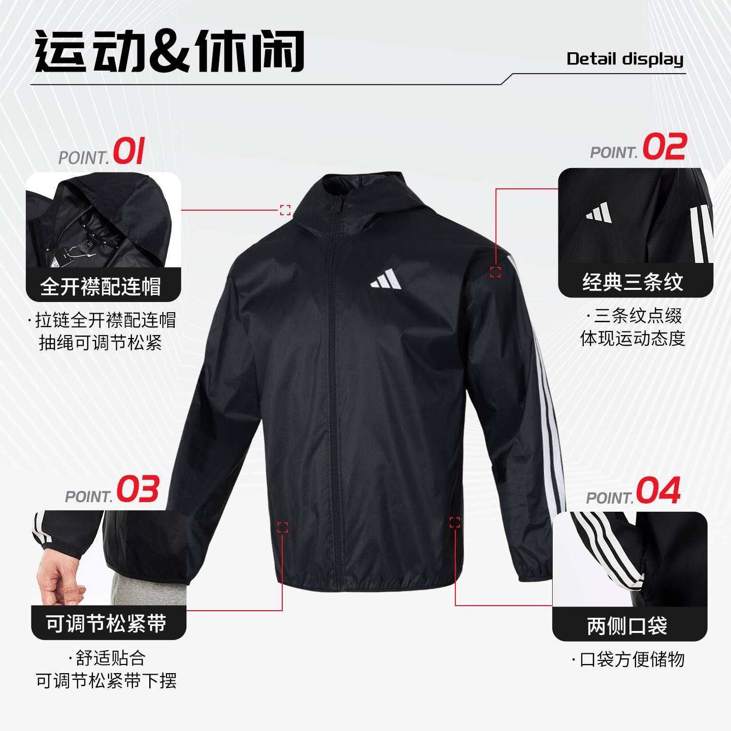 Adidas阿迪达斯外套男2025新款休闲运动服男士夹克三条纹连帽风衣