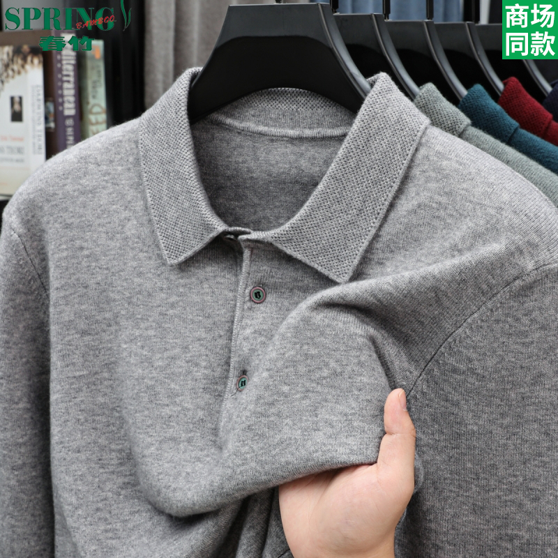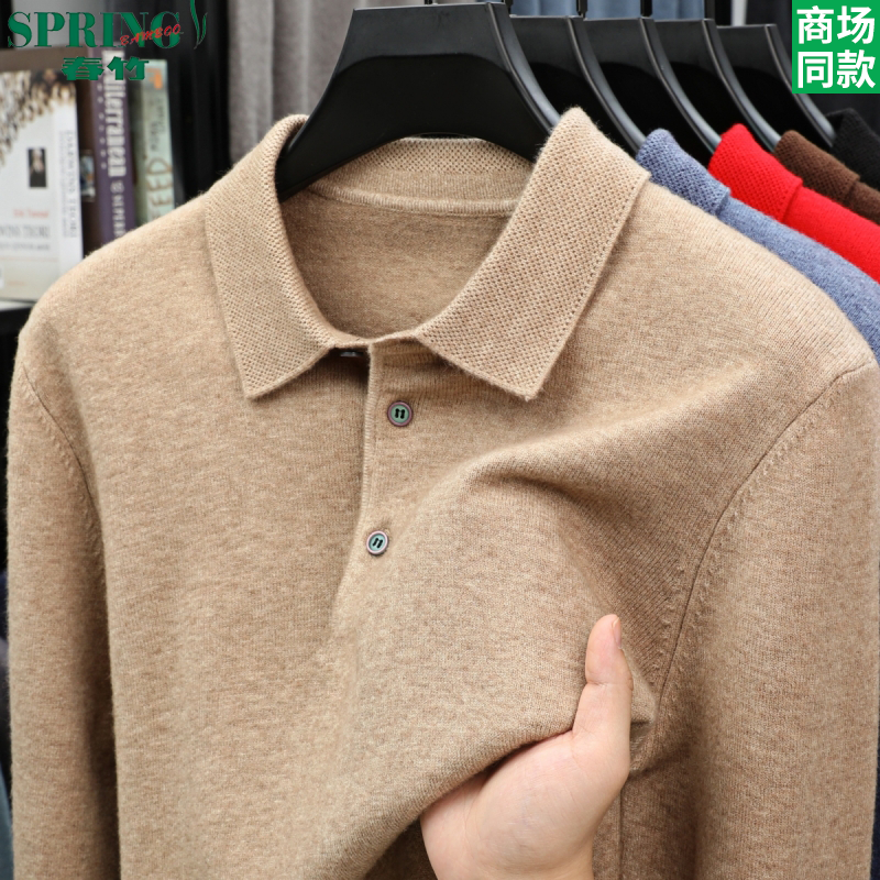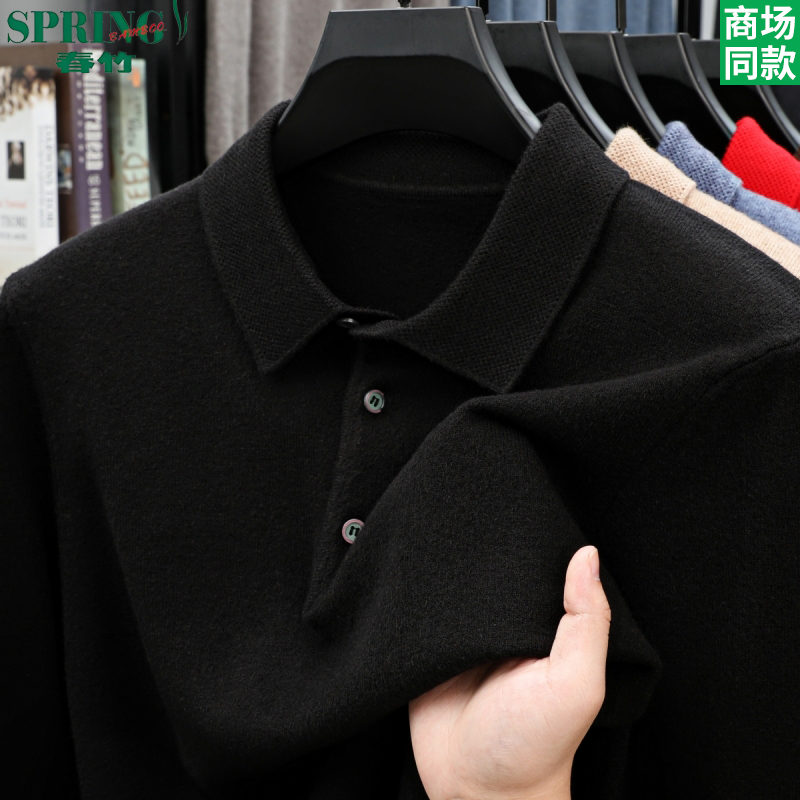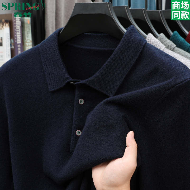春竹100%羊毛衫男士翻领polo衫休闲长袖T恤中老年宽松针织打底衫
