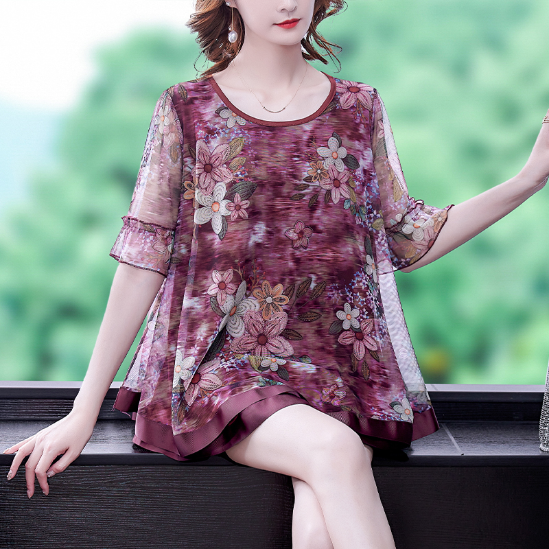 中长款雪纺网纱衬衫女2021新款宽松显瘦妈妈打底小衫洋气短袖上衣