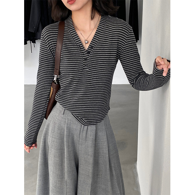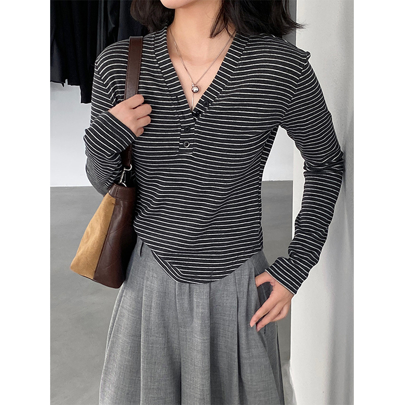 正肩v领条纹2025网红爆款针织衫女内搭打底衫可外穿质感初秋上衣
