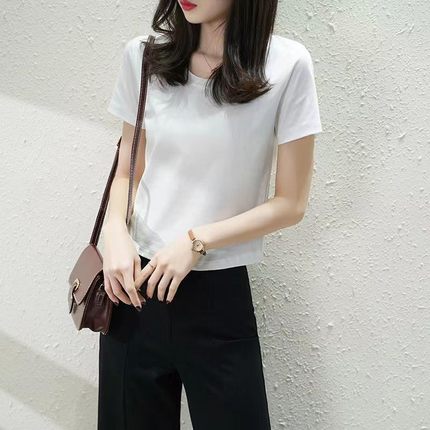 小个子短款丝光棉短袖T恤女全棉冰丝夏季款上衣V领修身显瘦体恤衫