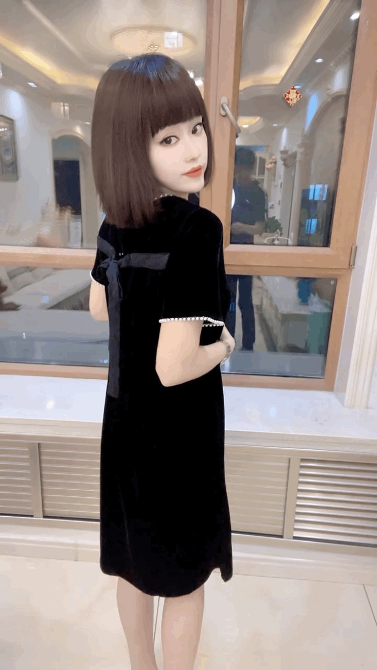 钉珠设计感金丝绒短袖连衣裙女新款宽松显瘦百搭黑色丝绒圆领裙子