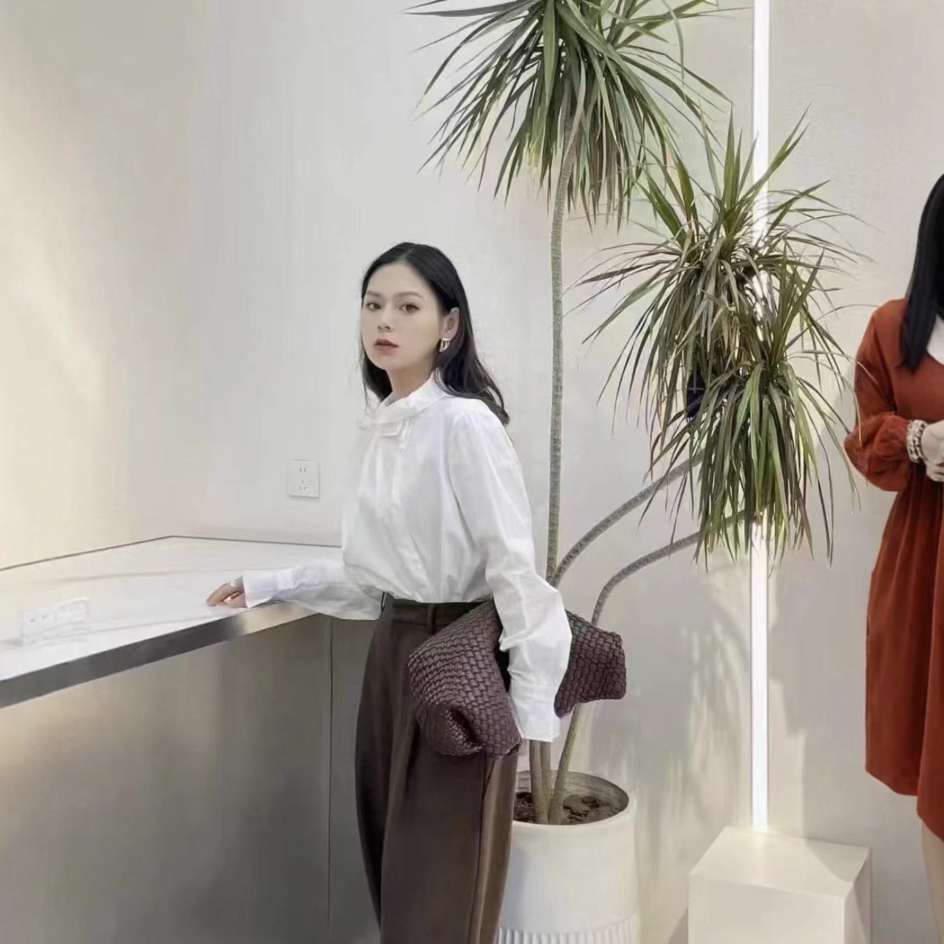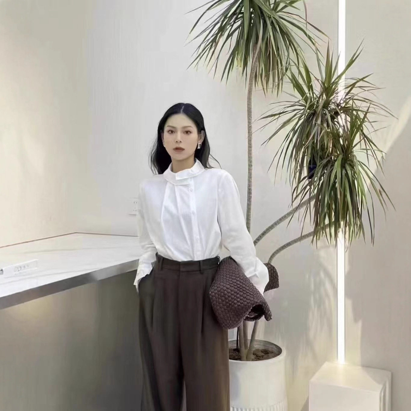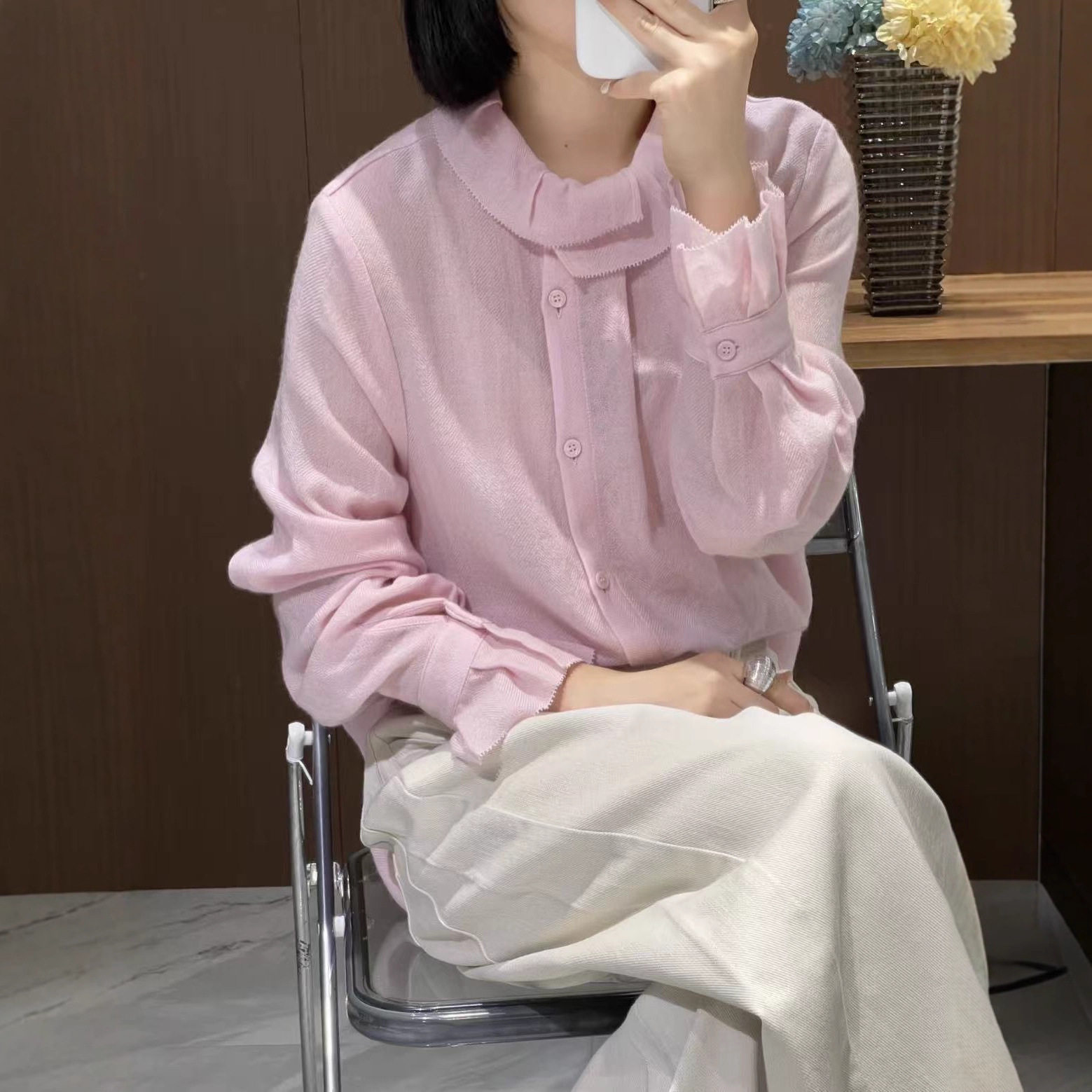 法式优雅女人 100%绵羊毛复古荷叶边领不对称人字纹温柔气质衬衫
