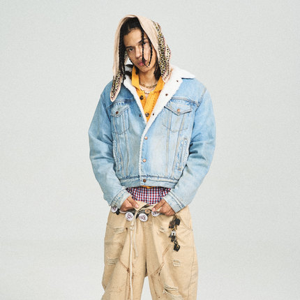 STEEPC Super Junior曺圭贤羊羔绒翻领水洗做旧牛仔夹克短宽外套
