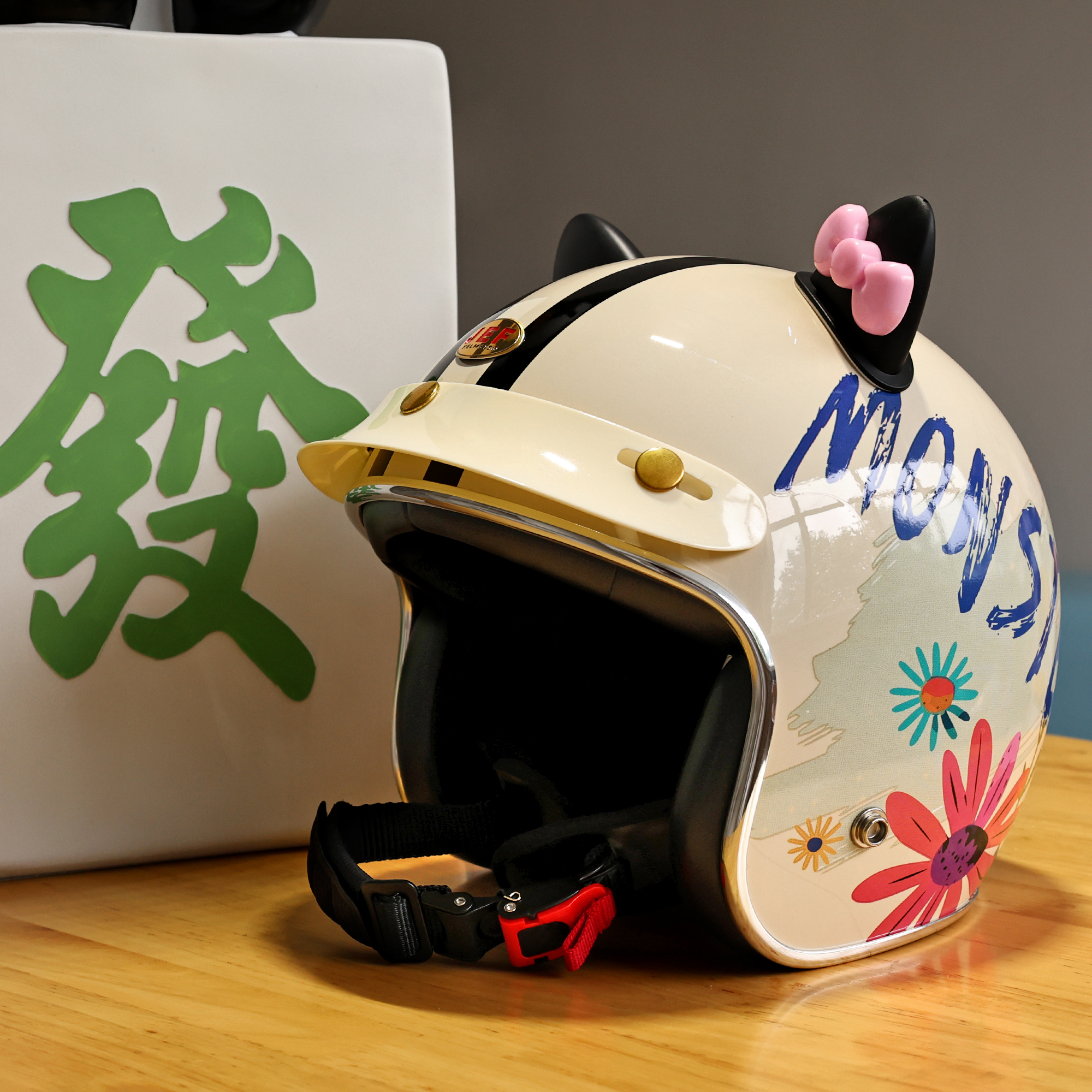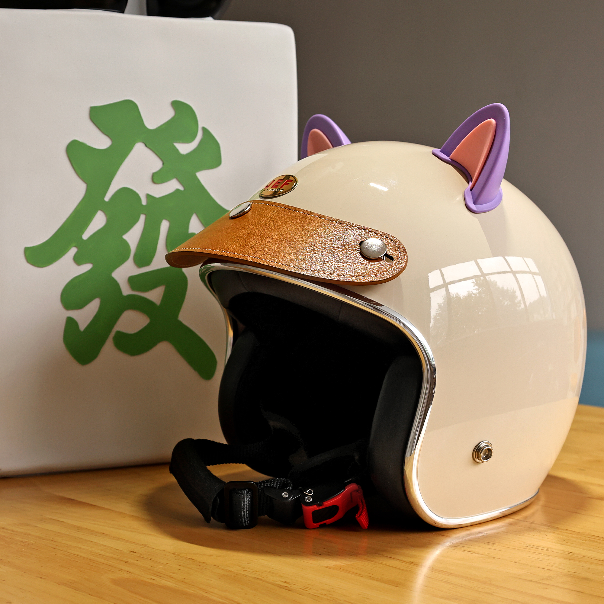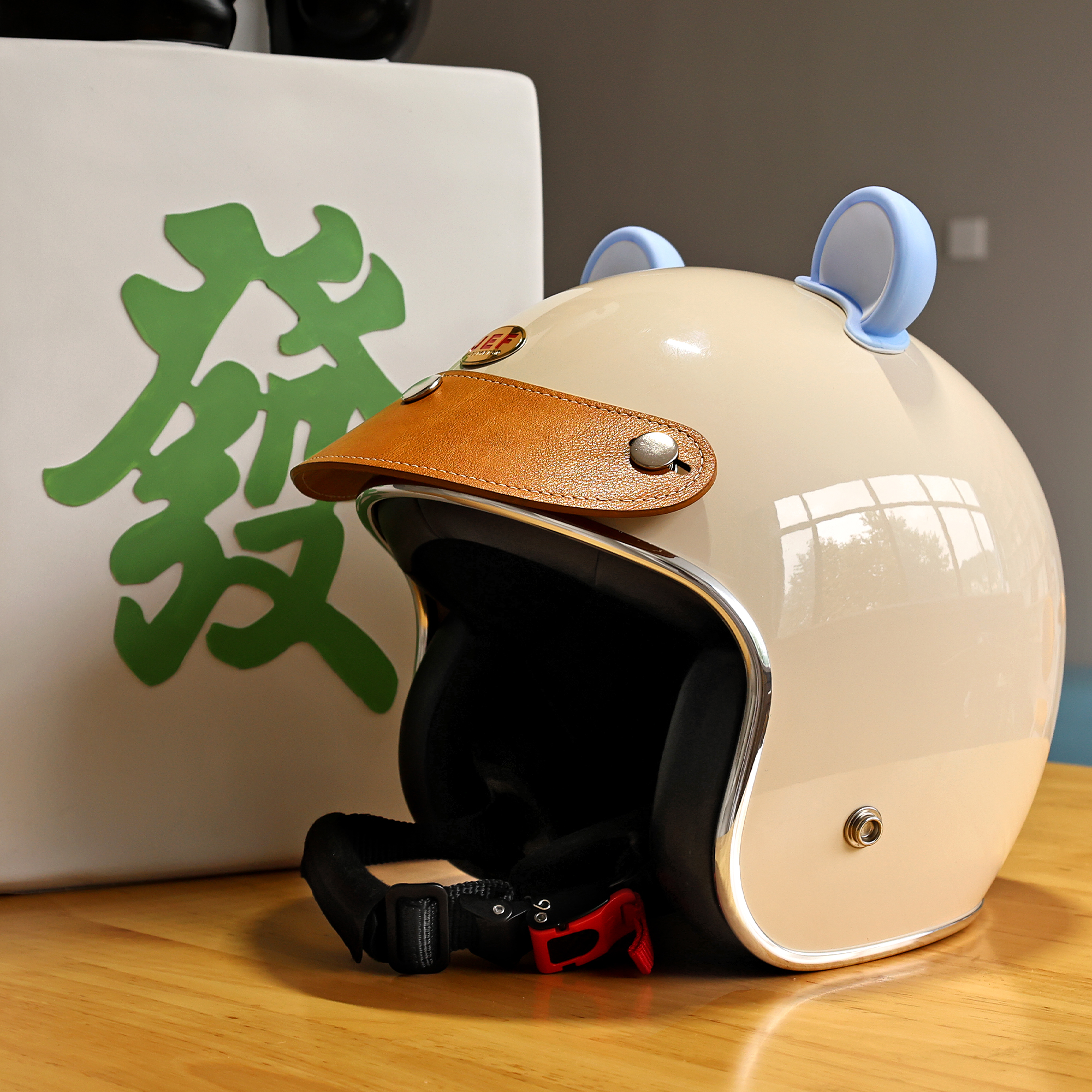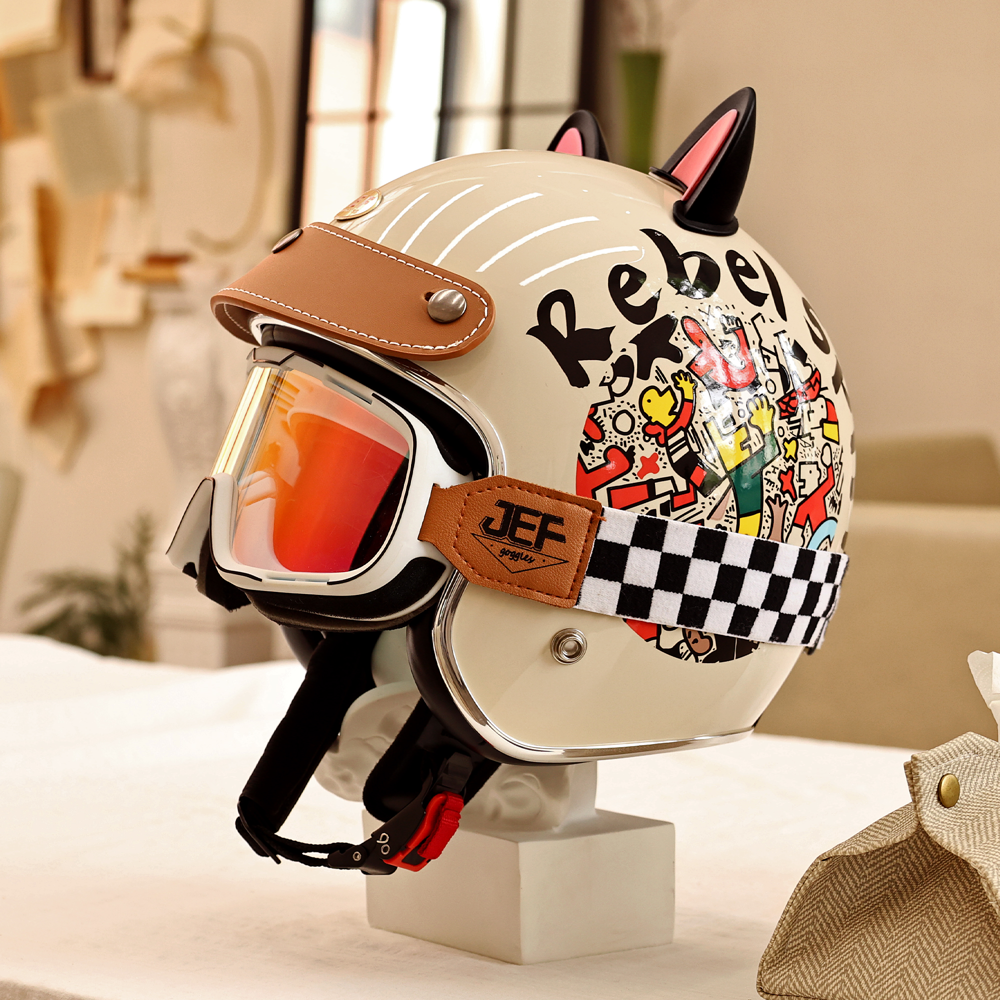 台湾JEF复古耳朵装饰摩托车头盔四季通用安全盔男女机车骑行3/4盔