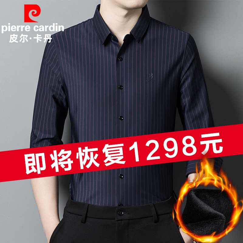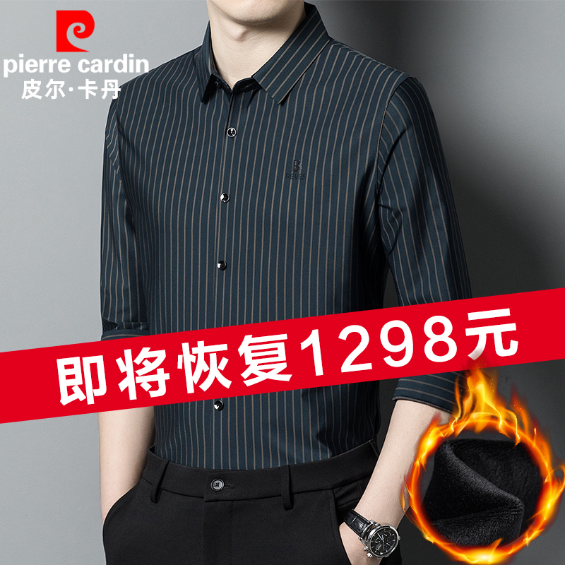 皮尔卡丹高级感免烫长袖衬衫男士秋冬款时尚条纹休闲加绒保暖衬衣