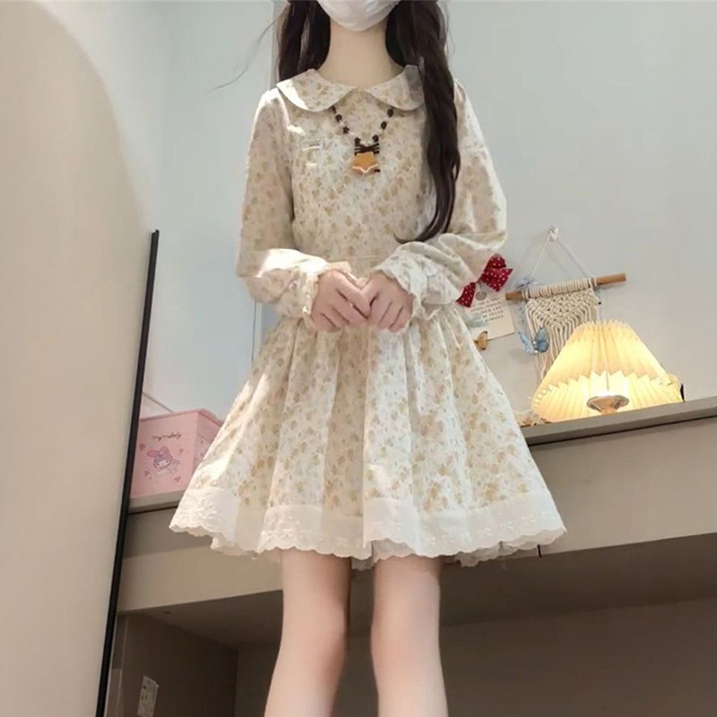 学院风甜美碎花娃娃领连衣裙女多巴胺绑带开衫毛衣外套两件套装