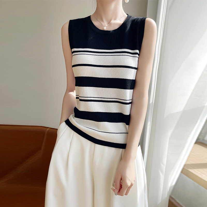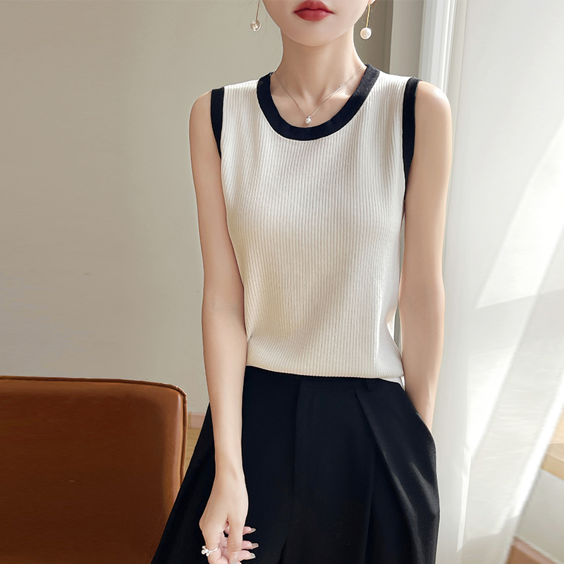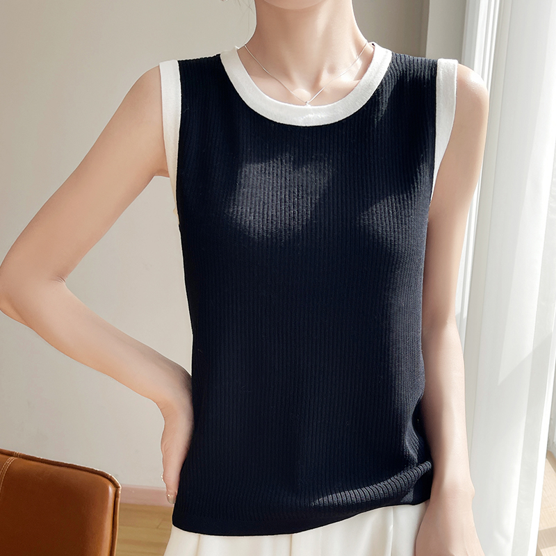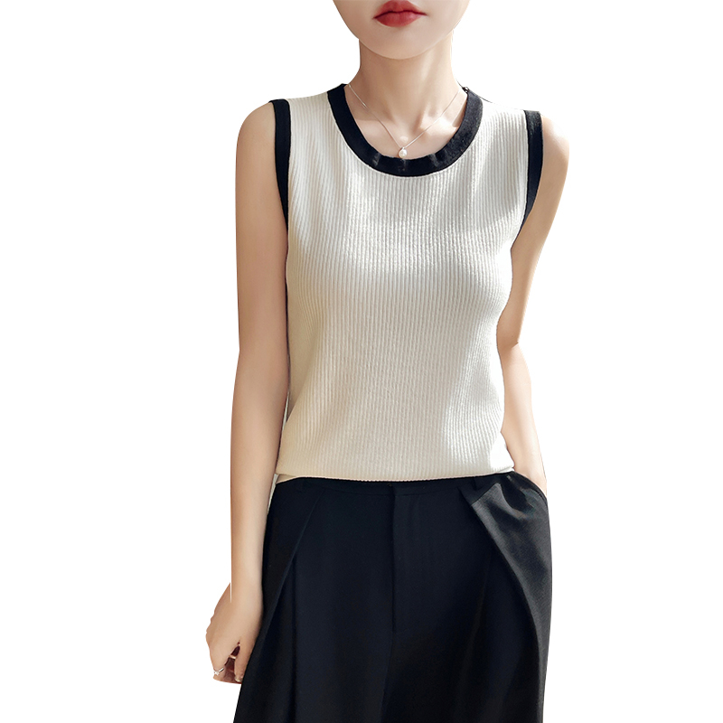 25年夏新款冰丝曲珠针织背心女拼色圆领吊带内搭抽条显瘦无袖上衣