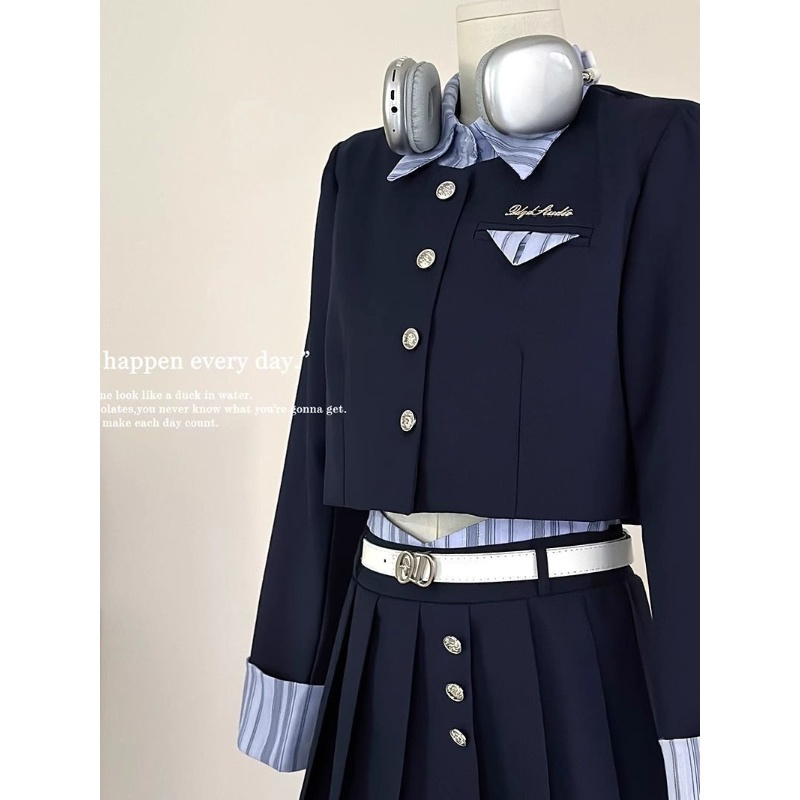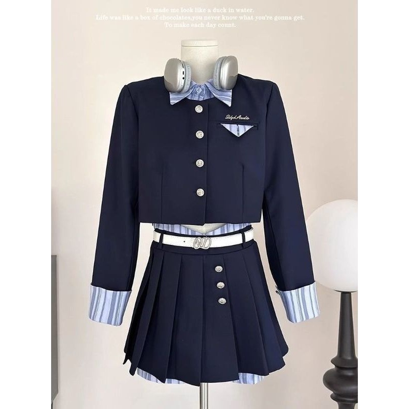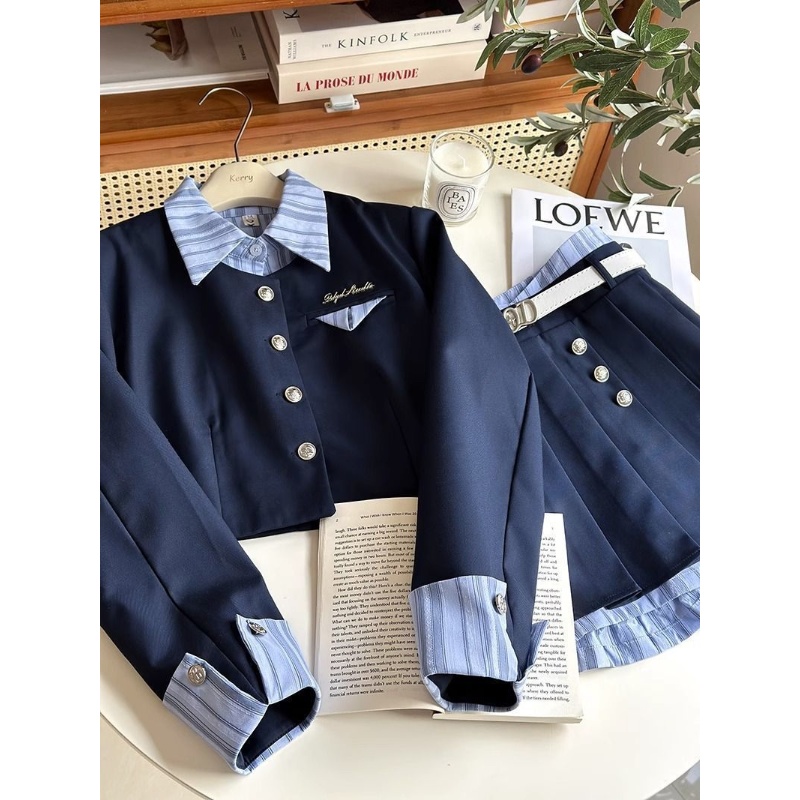 秋冬美式学院风假两件上衣套装大码女装辣妹高级感百褶短裙两件套