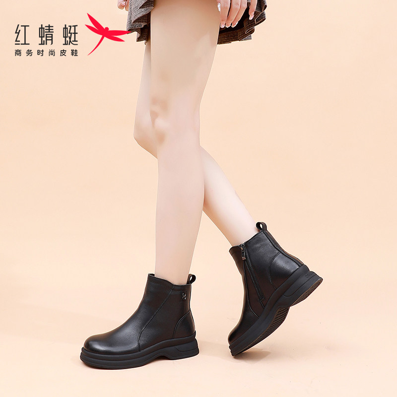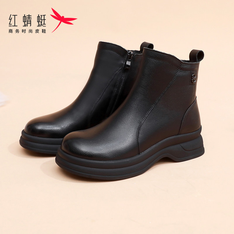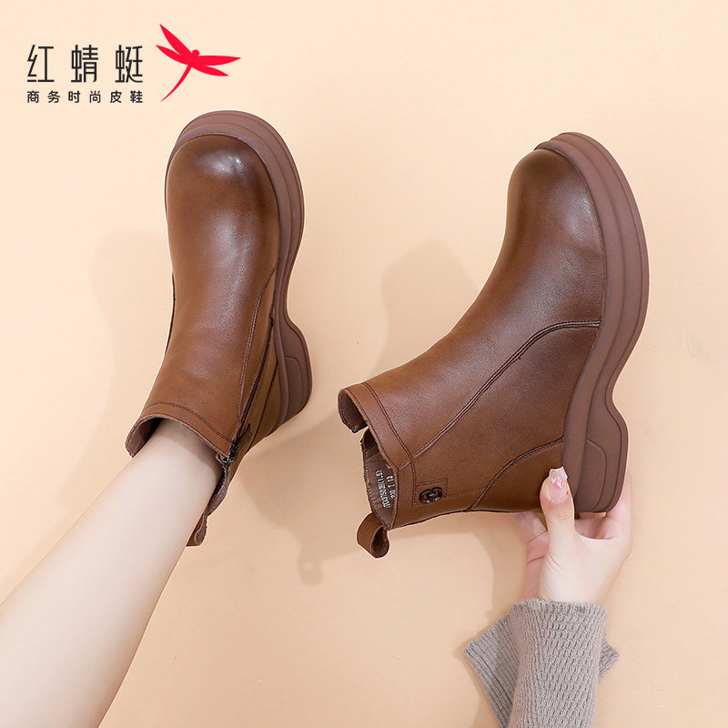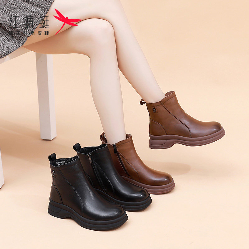 红蜻蜓真皮加绒厚底短靴时尚复古