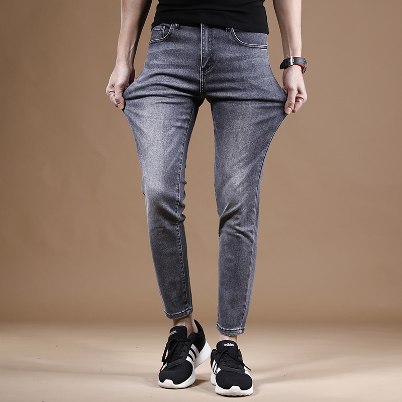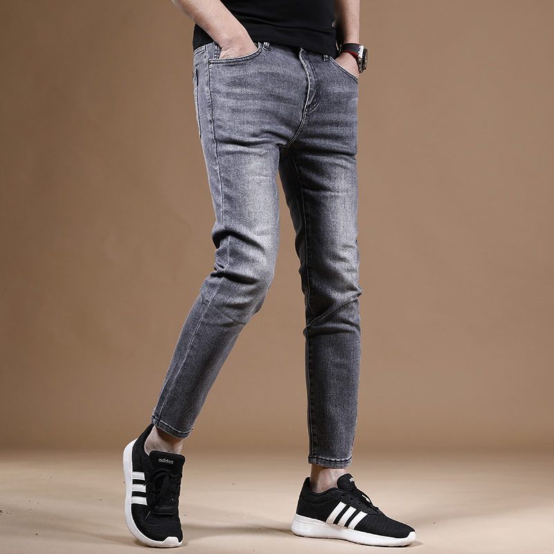 高端九分牛仔裤男夏季薄款潮牌修身小脚男士韩版烟灰9分休闲裤子