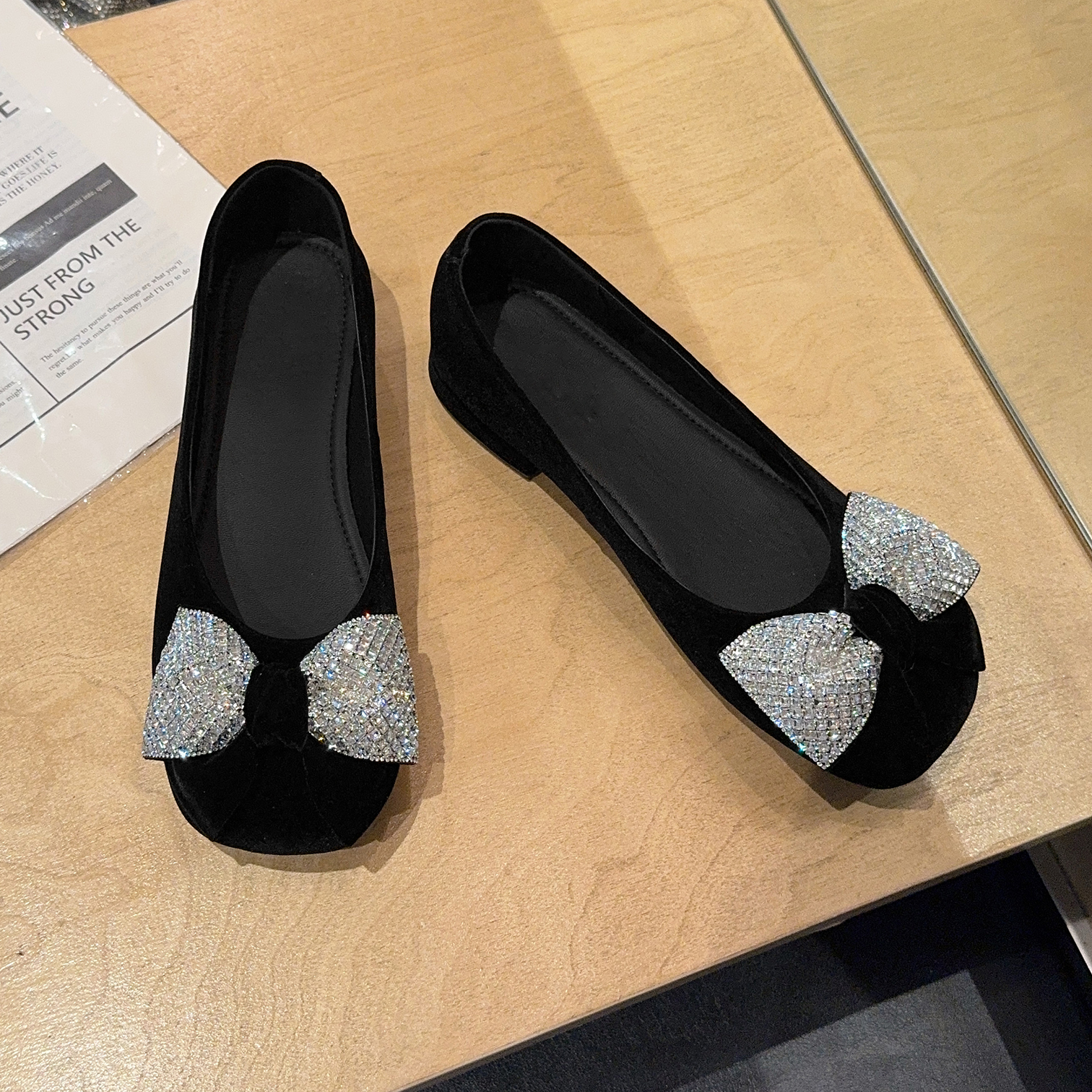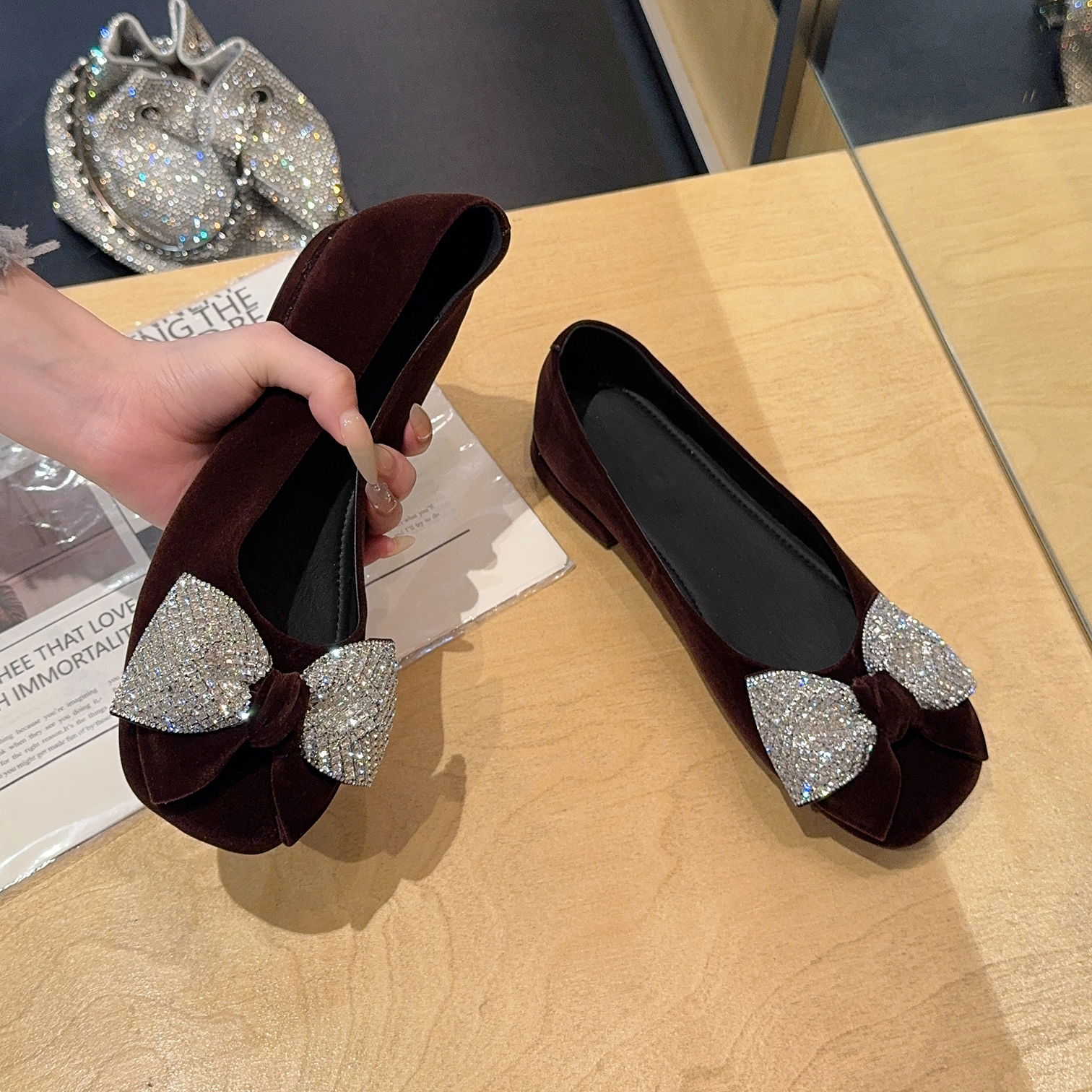 绒面水钻蝴蝶结单鞋法式平底鞋