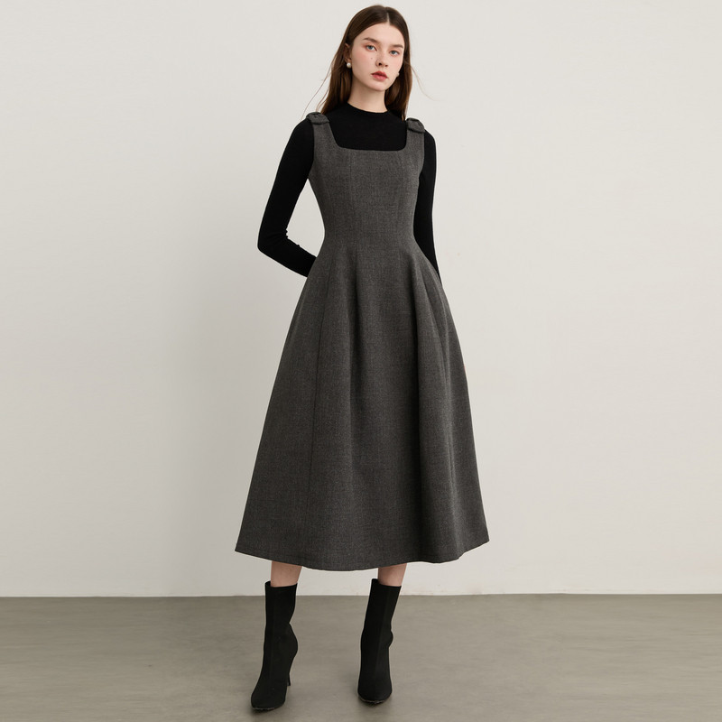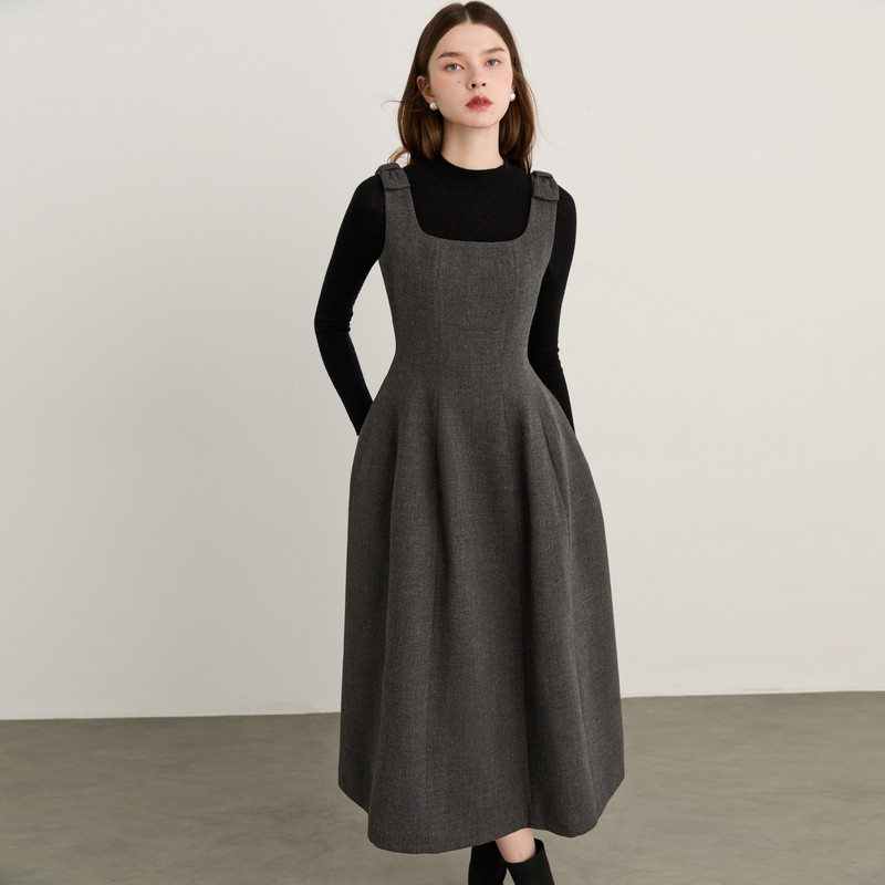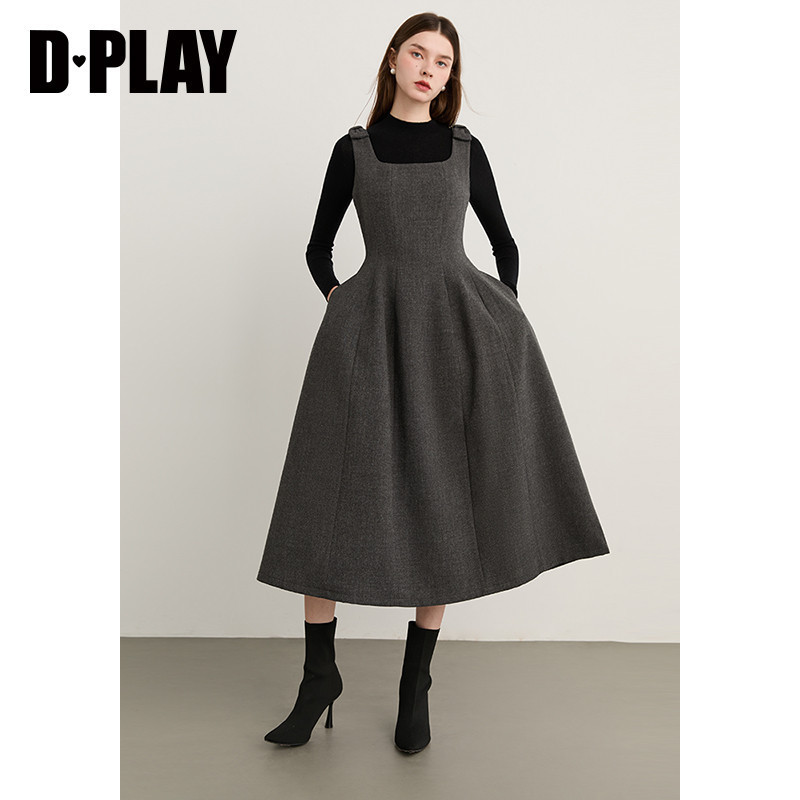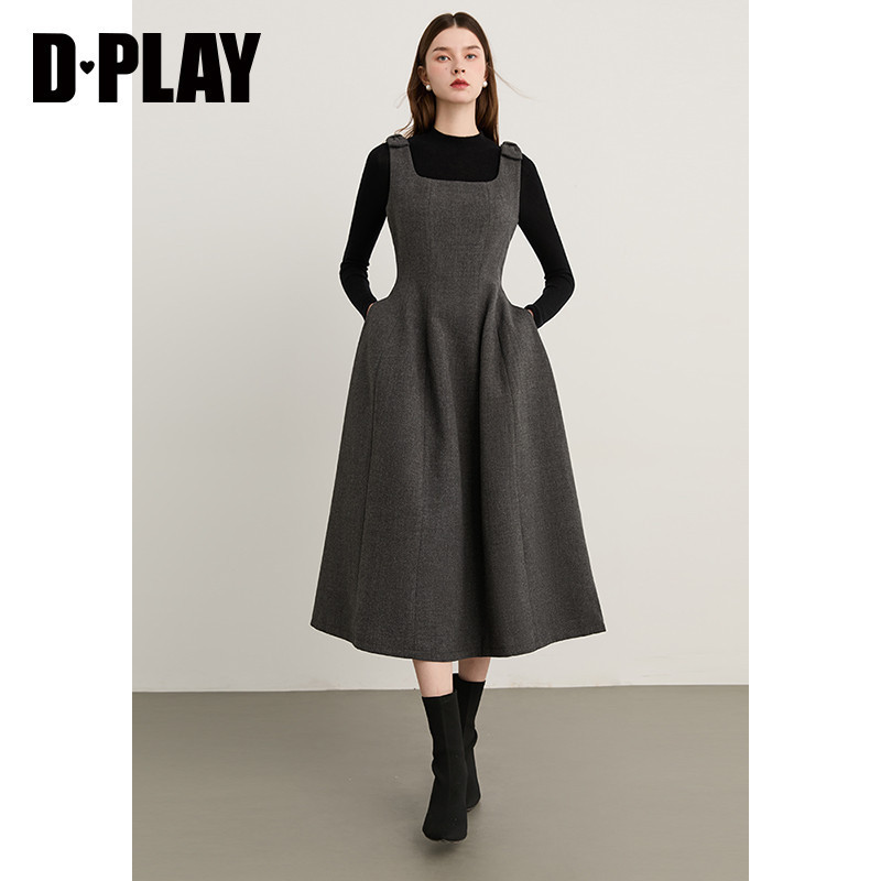 DPLAY2026年春季新款灰色连衣裙方领蝴蝶结肩带厚款好看长裙裙子