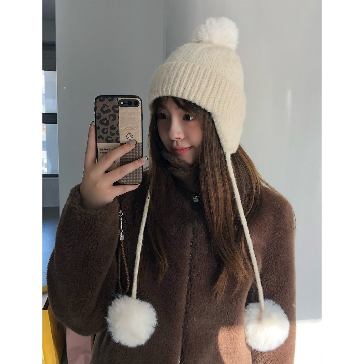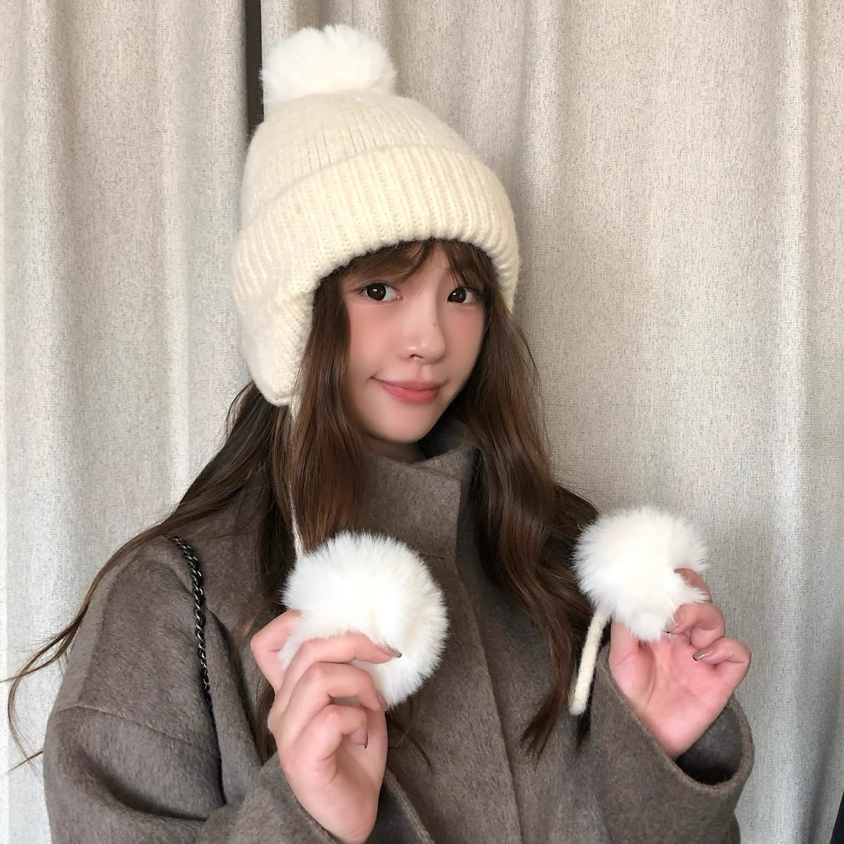 自留推荐!可爱毛球白色针织帽子女冬季护耳显脸小毛线帽保暖包头