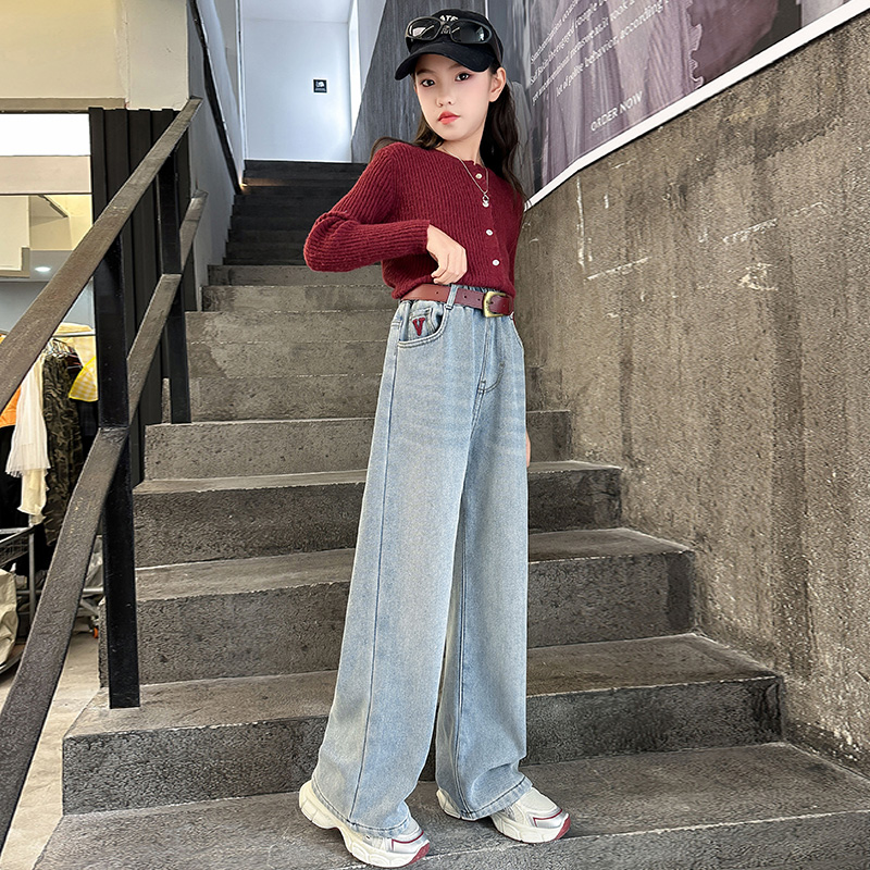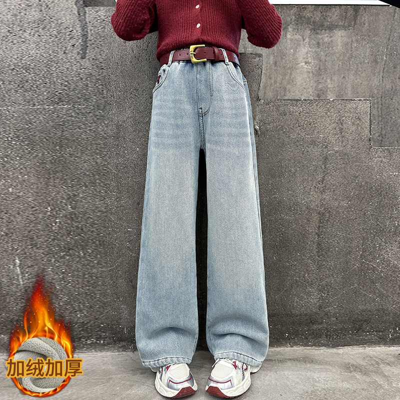 女童冬季加绒裤子秋冬2025新款女孩时尚刺绣一体绒儿童窄版牛仔裤