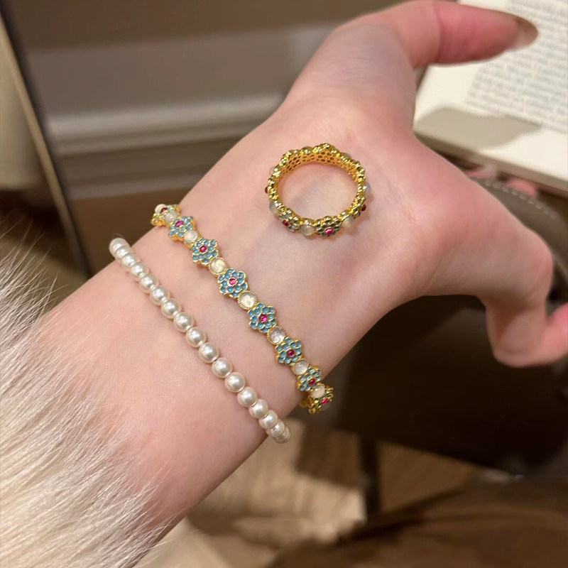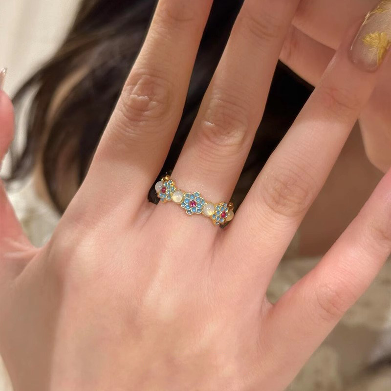新中式蓝色滴釉花朵玉髓戒指女小众设计轻奢高级感食指戒精致手镯