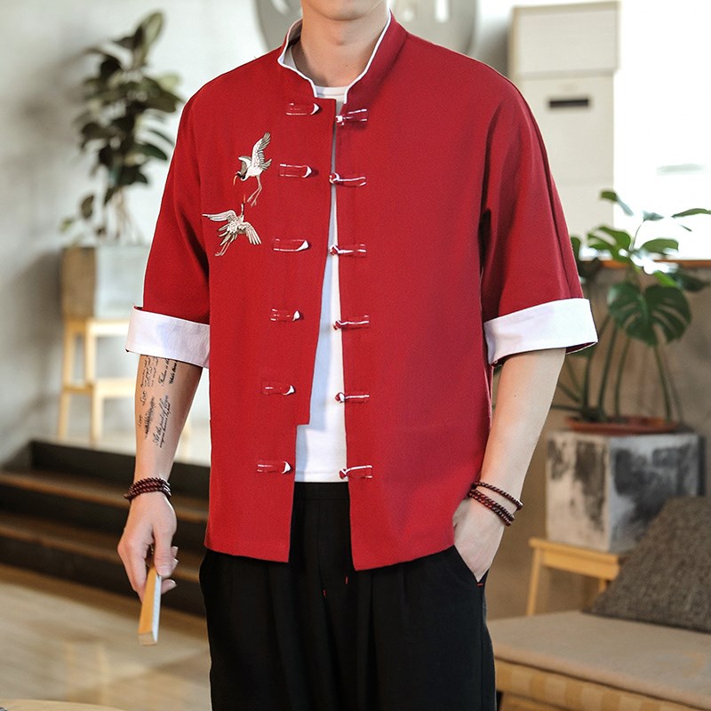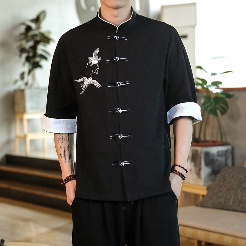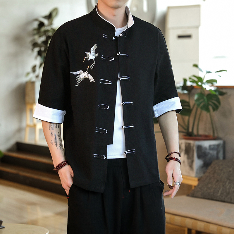 中式五分袖衬衫男立领中山领衬衣半截袖唐装对襟褂子中国风打底衫