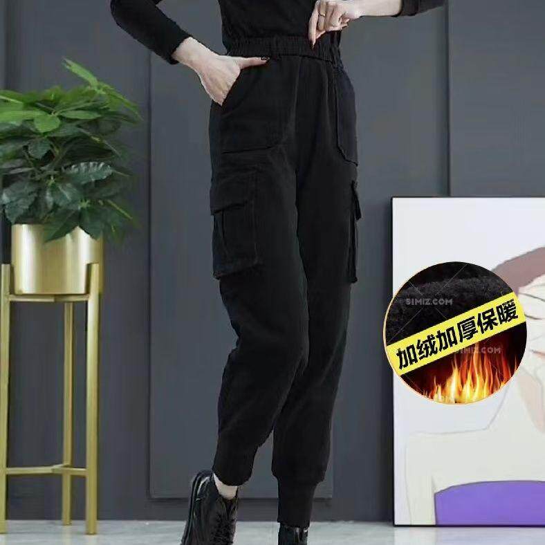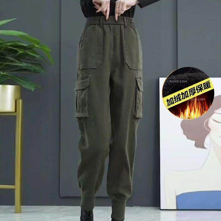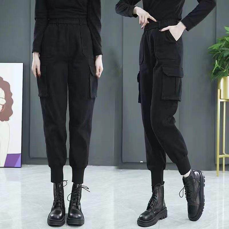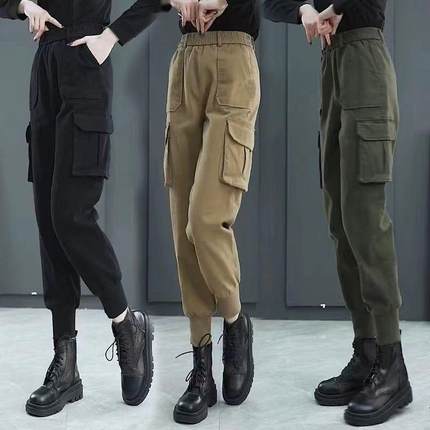 加绒高腰工装裤女春秋新款小个子休闲哈伦裤冬季搭配马丁靴束脚裤