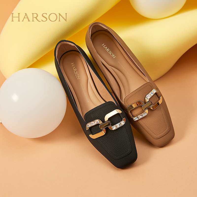 哈森秋季商场新款高级感金属扣单鞋低跟方头乐福鞋HL227117