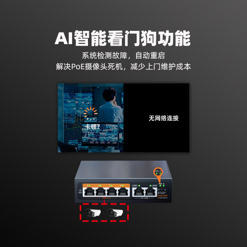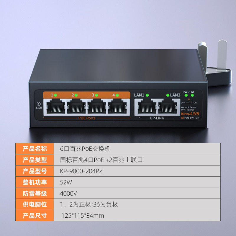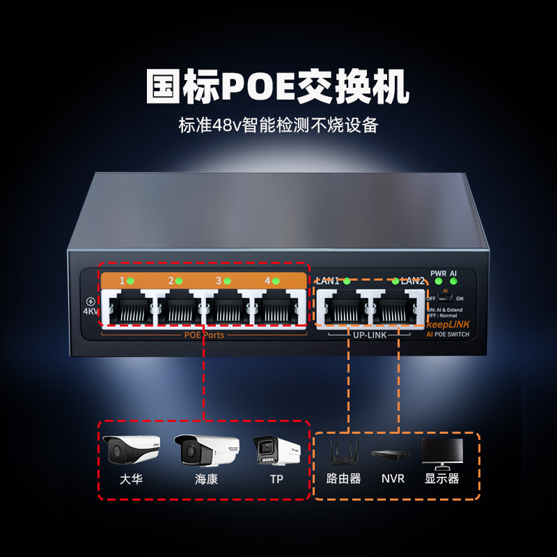 keepLINK POE交换机百兆6口AI智能监控光纤网线供电48V无线AP国标兼容支持海康大华TP摄像头