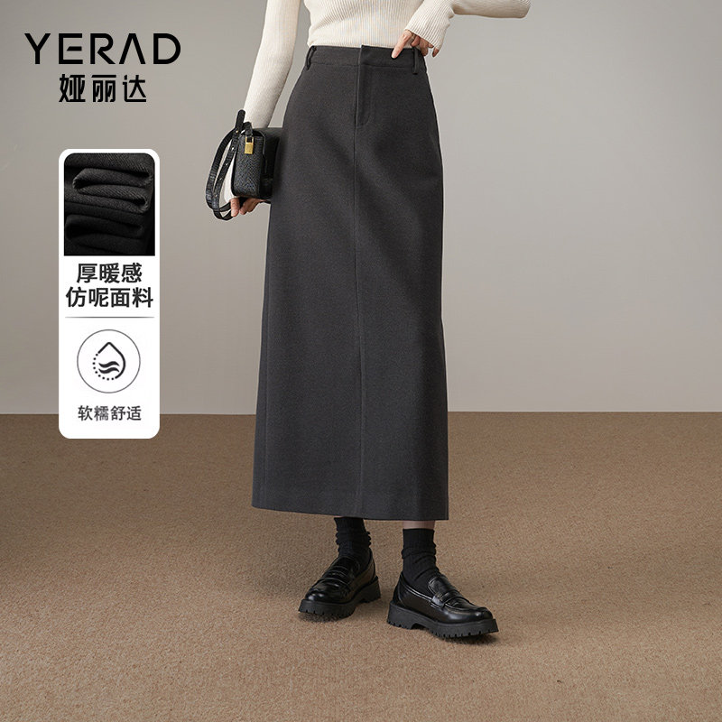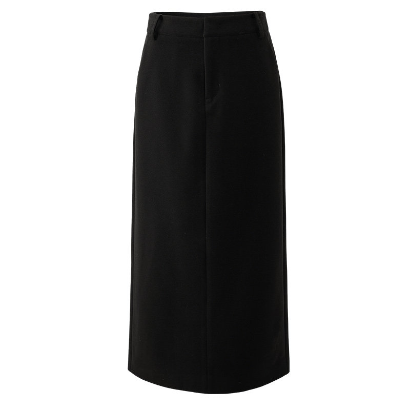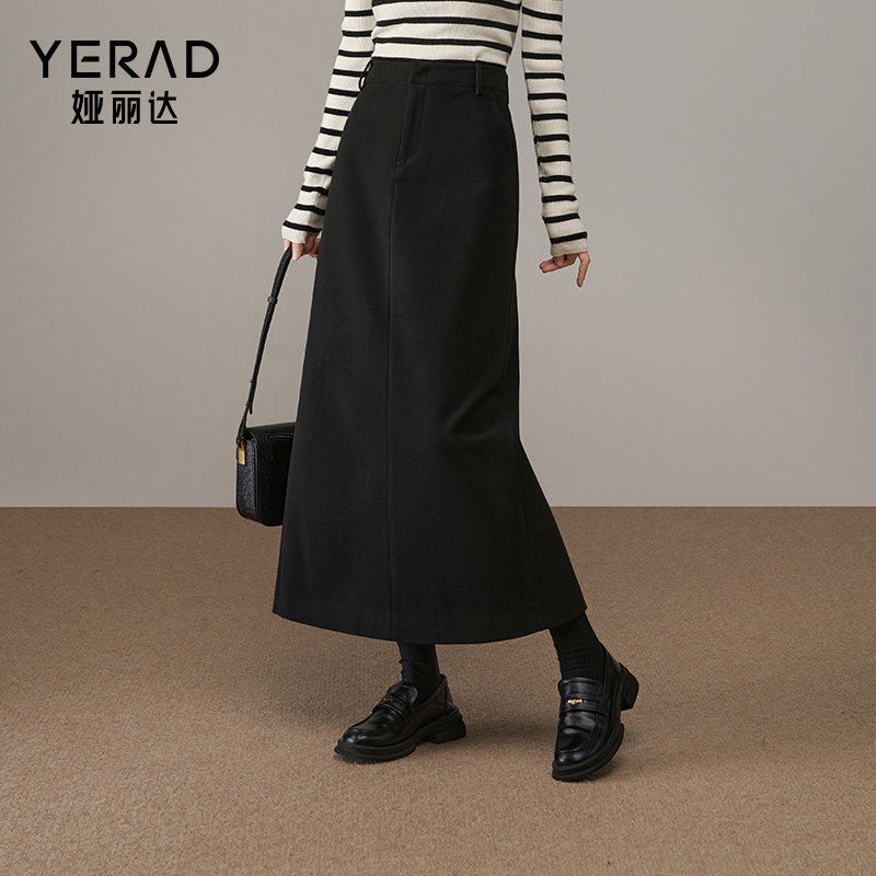 娅丽达秋冬季加厚仿毛呢直筒半身裙女2024新款通勤气质黑色长裙子
