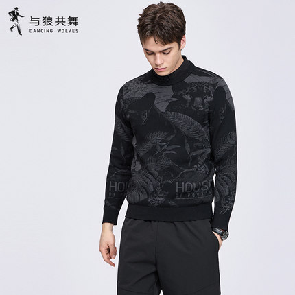 【暗纹】与狼共舞假两件翻领羊毛衫男士2025秋冬新款保暖针织毛衣