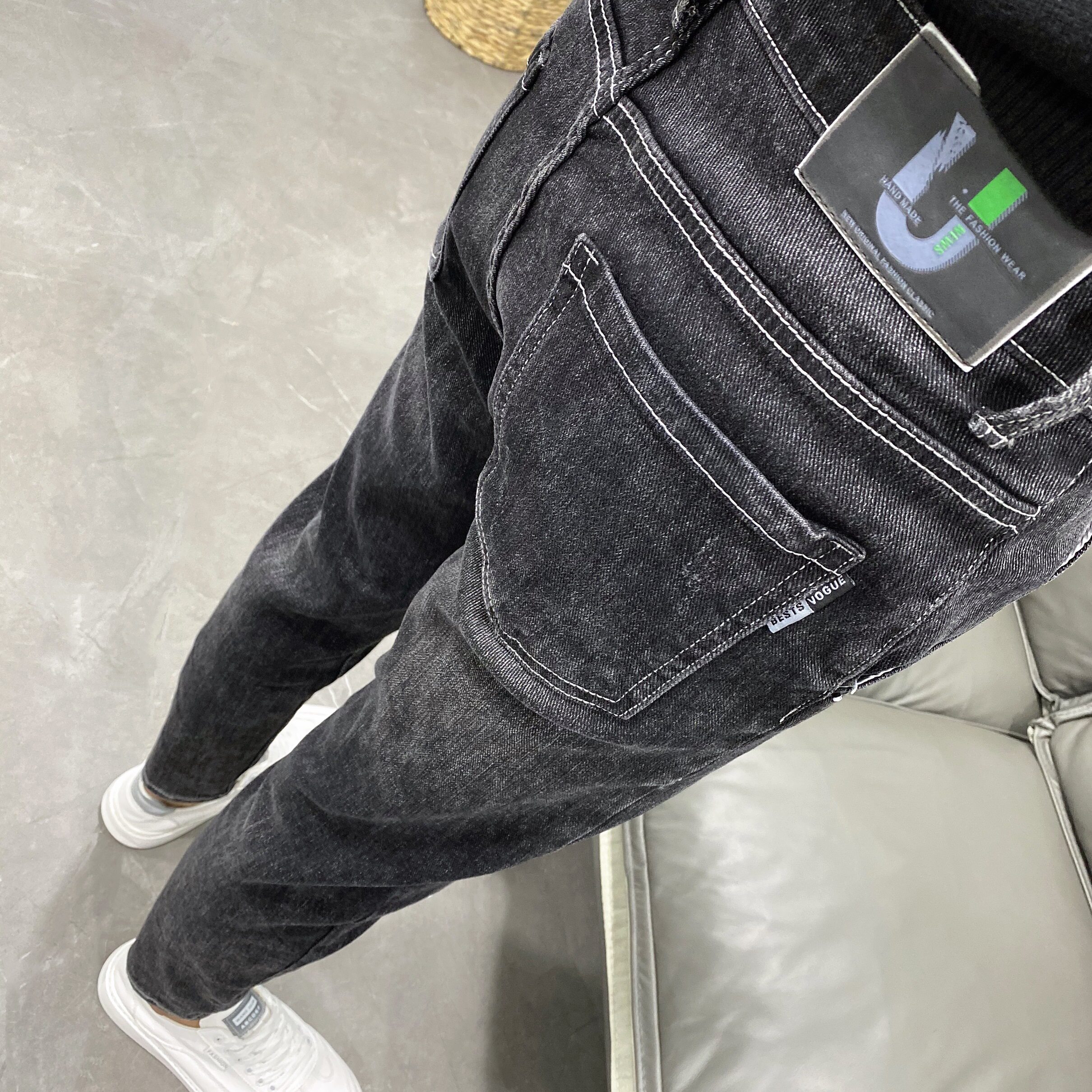 斜插口袋黑灰微垮长裤修身牛仔裤