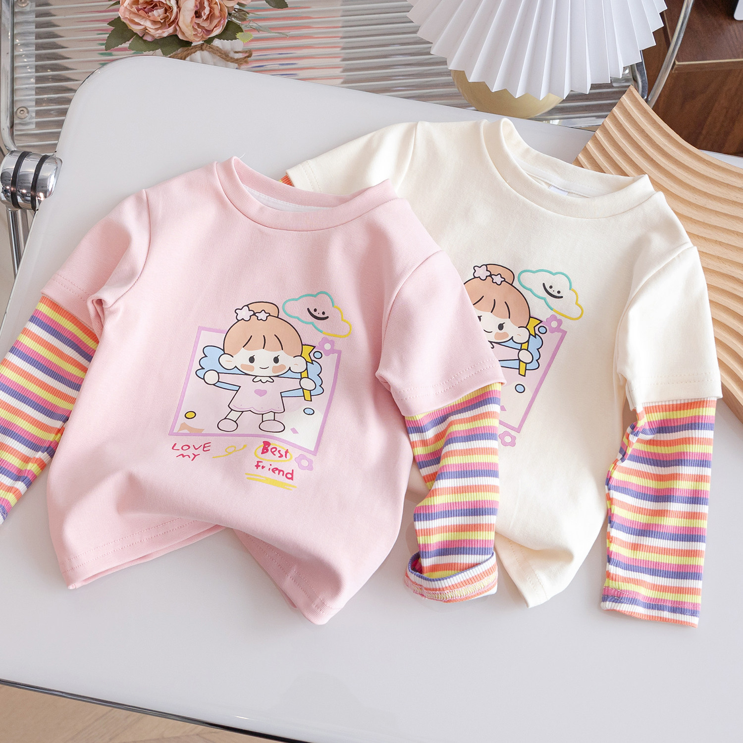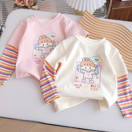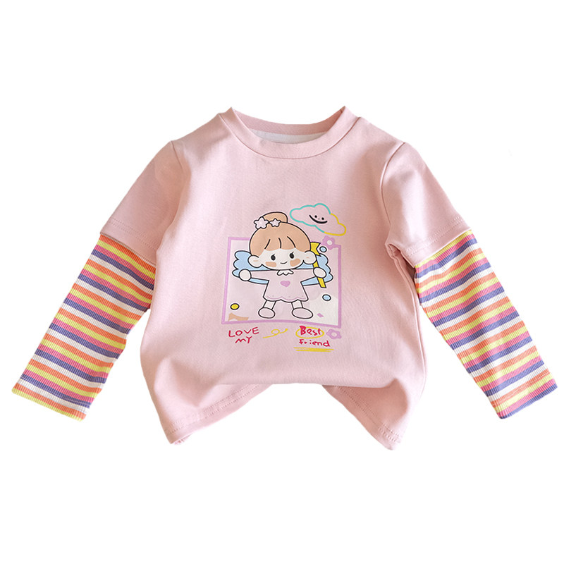 女童纯棉长袖T恤秋季卡通上衣中小童春秋款女宝宝条纹拼接打底衫3