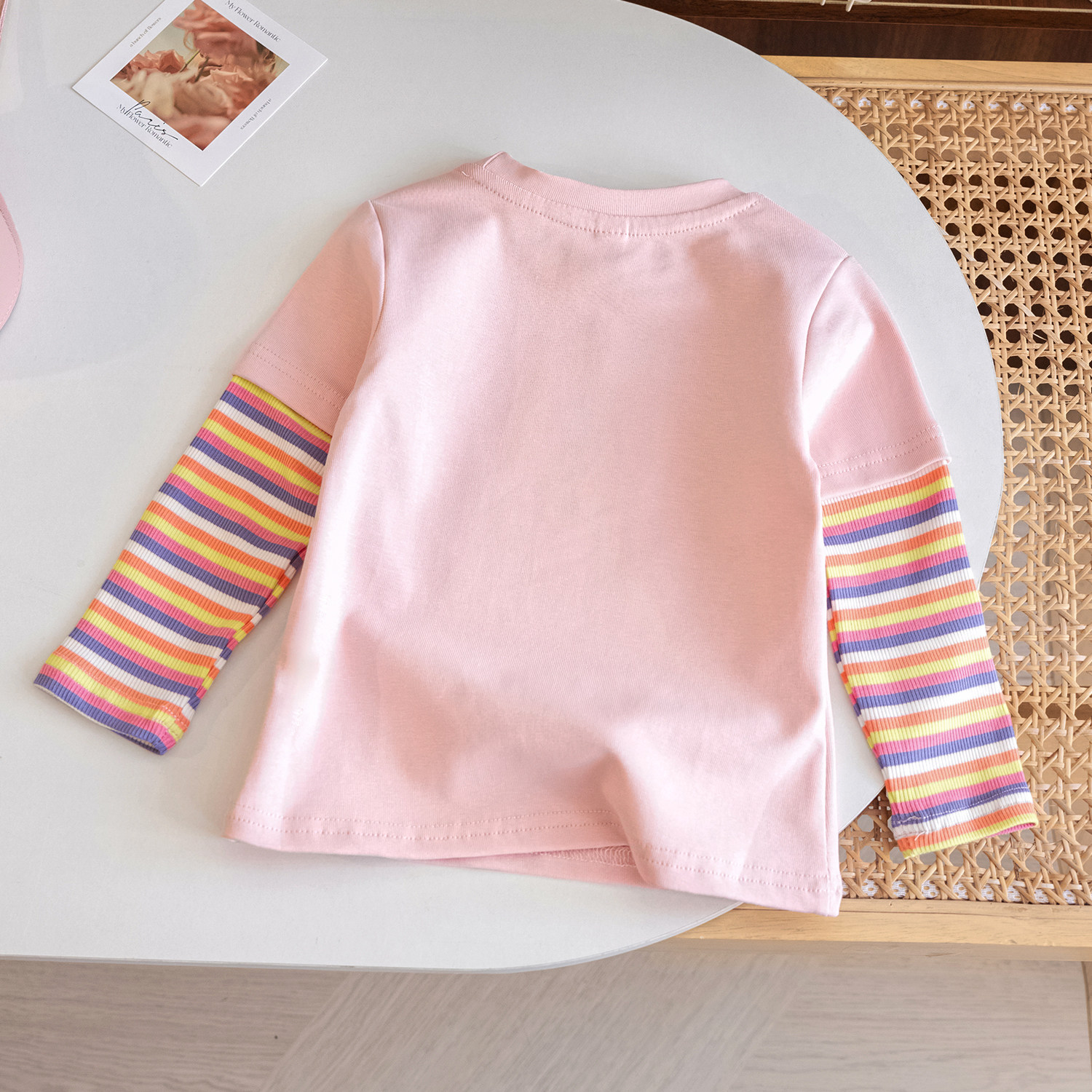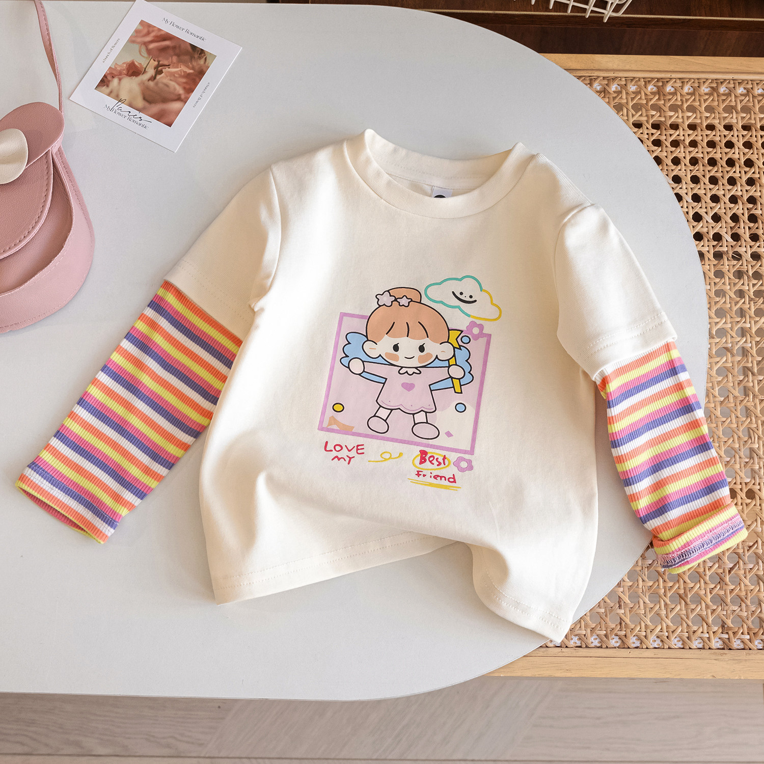 圆领卡通长袖条纹拼接打底衫T恤
