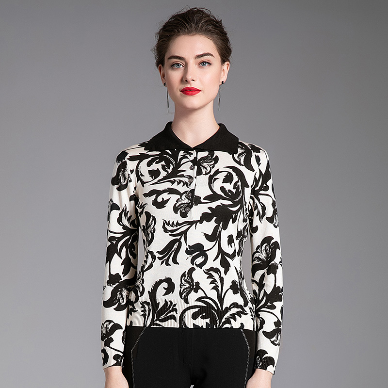 优媛昊艺秋季新款桑蚕丝针织衫真丝印花长袖翻领半开衫上衣女装