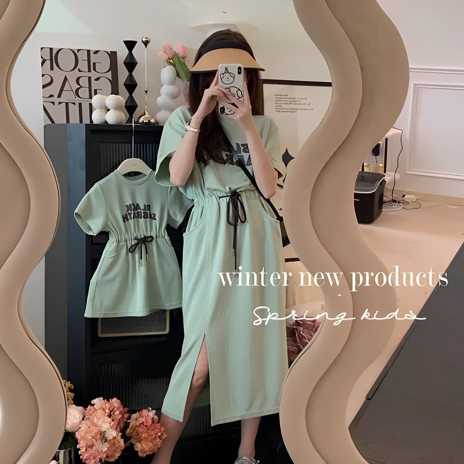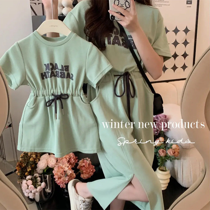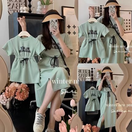 韩版亲子装一家三口夏装高端母女装连衣裙短袖婴儿宝宝夏季全家装