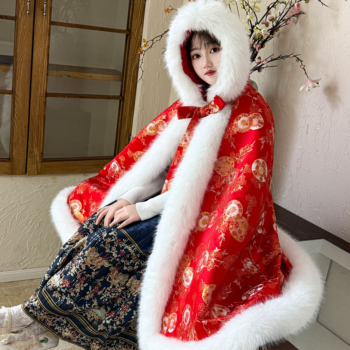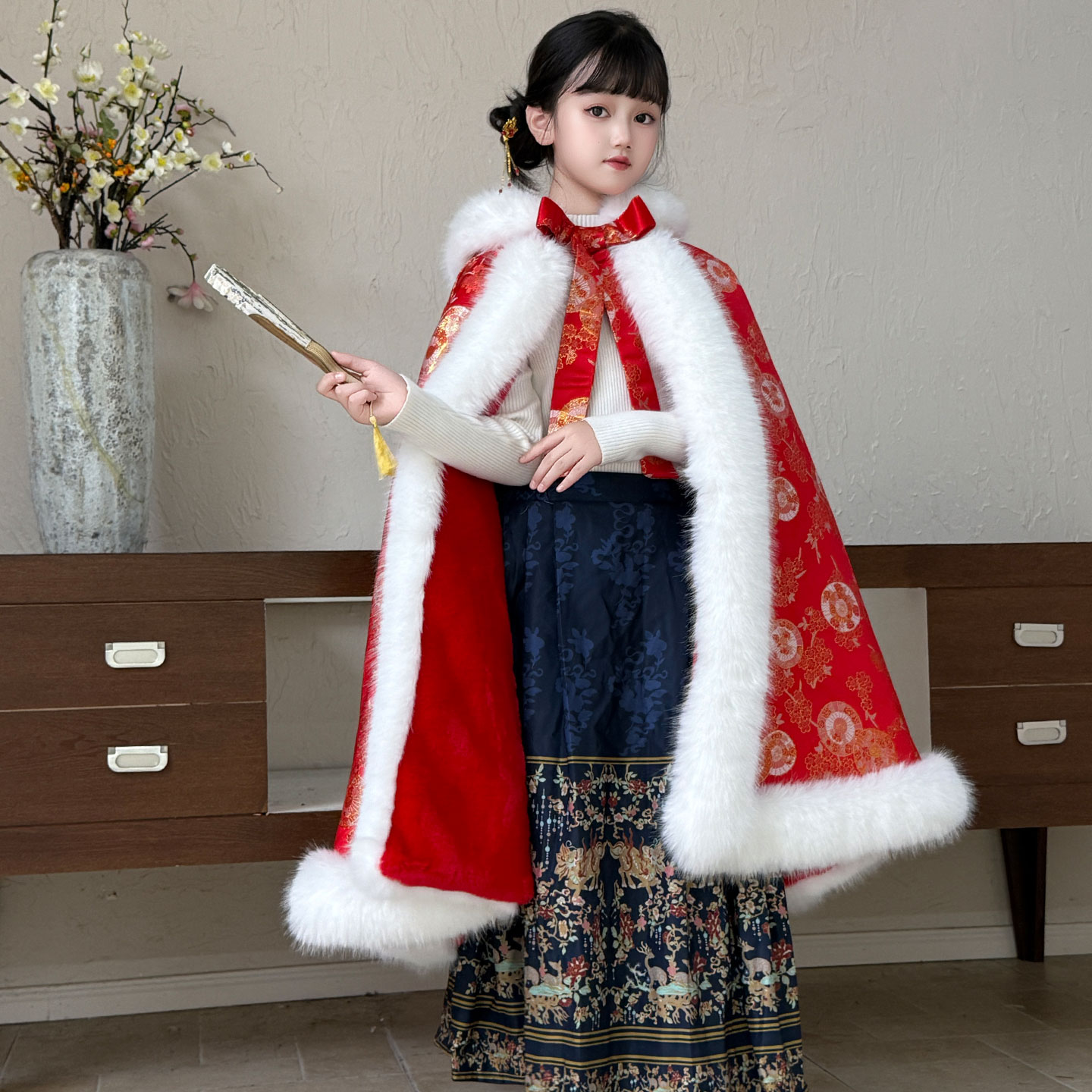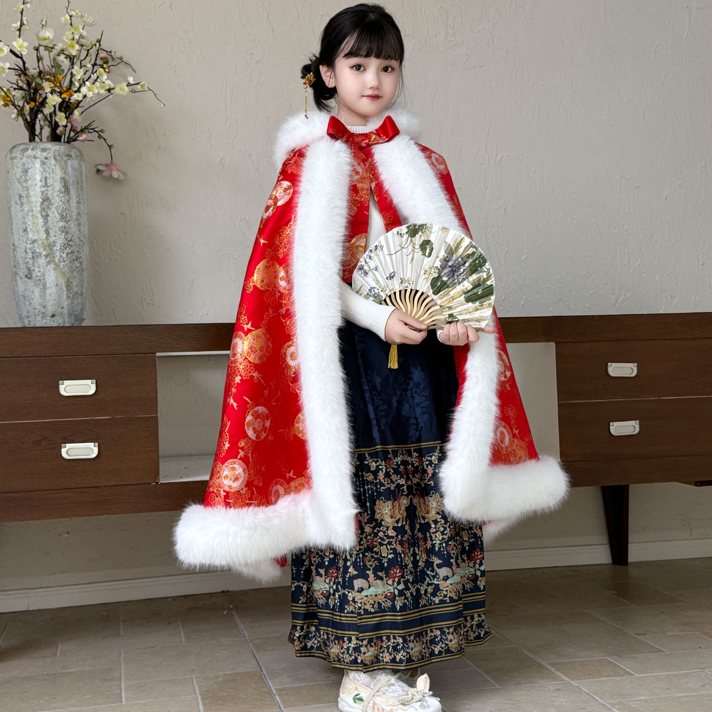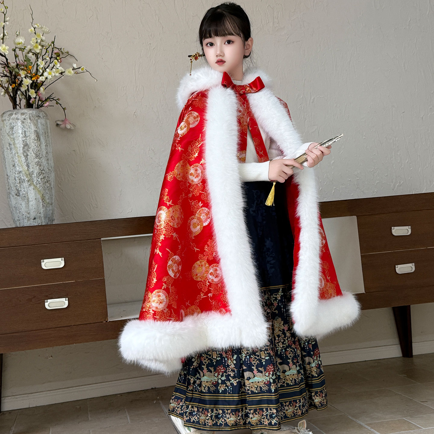 儿童披风斗篷女童国风汉服可爱拜年服秋冬季加绒保暖连帽披肩外套
