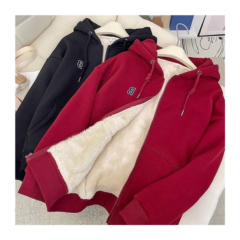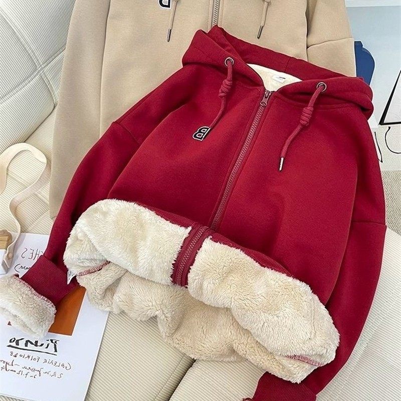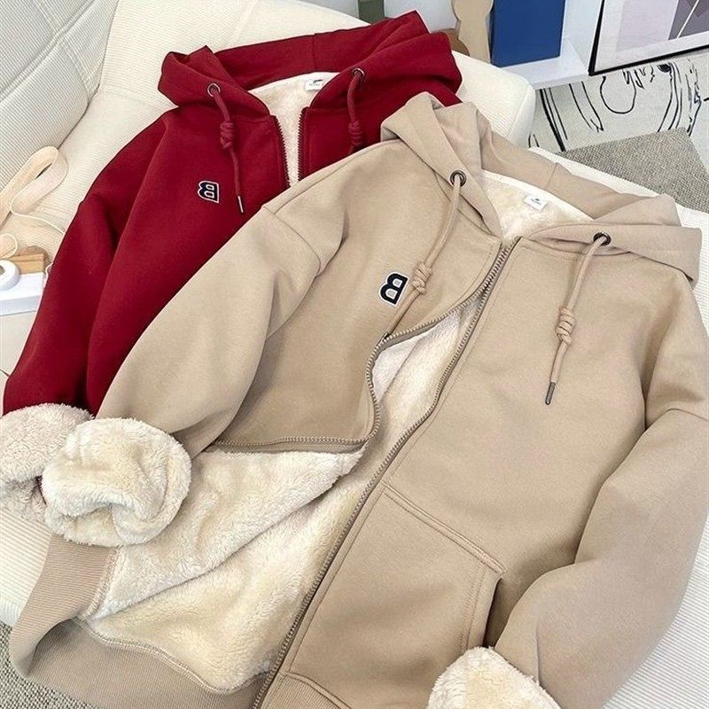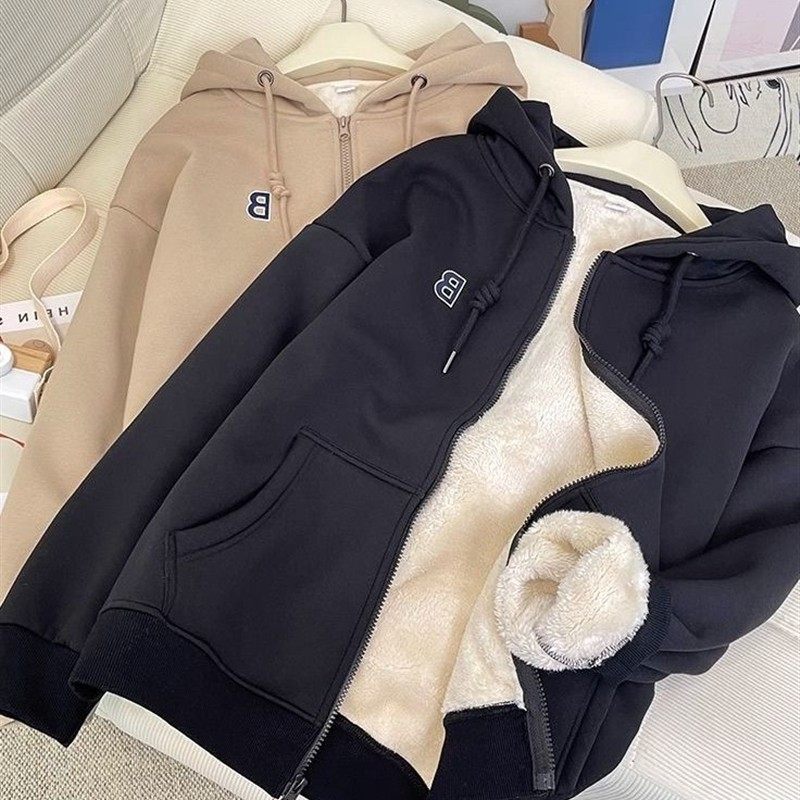 加绒加厚连帽羊羔绒卫衣女秋冬新款女士宽松保暖长袖开衫拉链外套