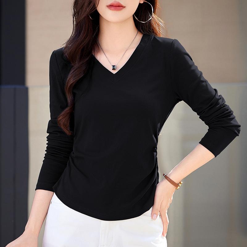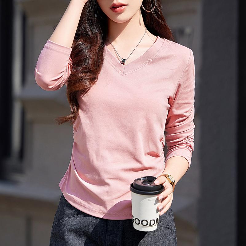 纯棉V领长袖T恤女新款遮肚子显瘦